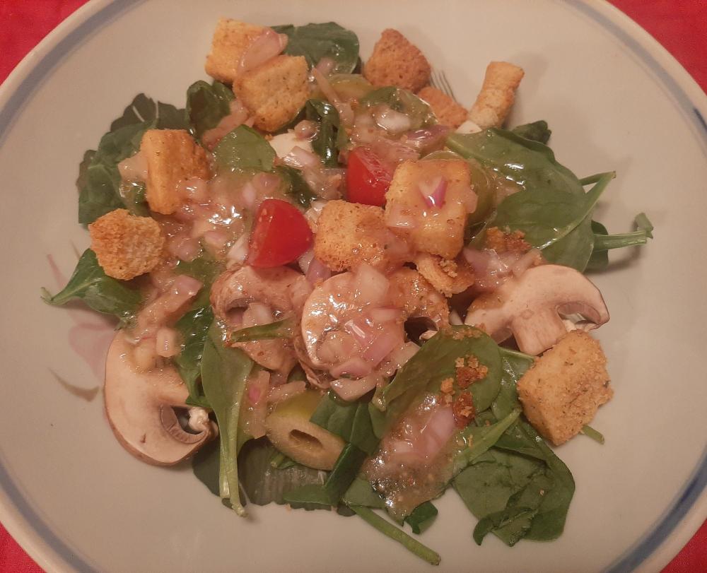 First attempt at making and using the House Dressing from Samin Nosrat's Good Things (eG-friendly Amazon.com link). I didn't bother trying any of her salad suggestions, as such: the salad is spinach, olives, tomatoes, a hard boiled egg, mushrooms and croutons. The "House Dressing" is a honey/mustard sherry vinaigrette. One of the interesting steps about it is that you finely dice a shallot, rinse it, then soak in the vinegar and a bit of warm water for a couple of minutes before whisking in the rest of the ingredients. I think the soak helped tame the shallot a bit. When I tasted the dressing by itself to adjust seasonings, I thought it would all be a bit much (too much vinegar, too much shallot) but atop the salad it tastes wonderful. I'll have no trouble using this batch. Edited to add: @blue_dolphin links to the dressing recipe in this post.