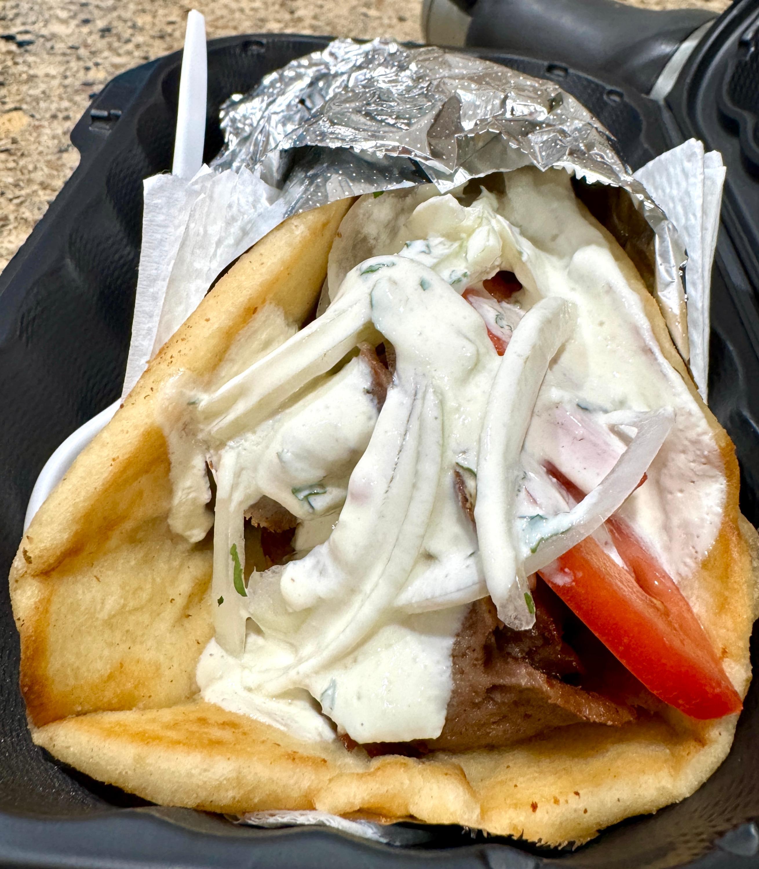 Gyros from the Greek Orthodox church. They used to do this once a year, now I think they are up to three annually. Unpictured baklava to go with, naturally. The picture looks tatziki-heavy but these were meaty gyros off a rotating spit.