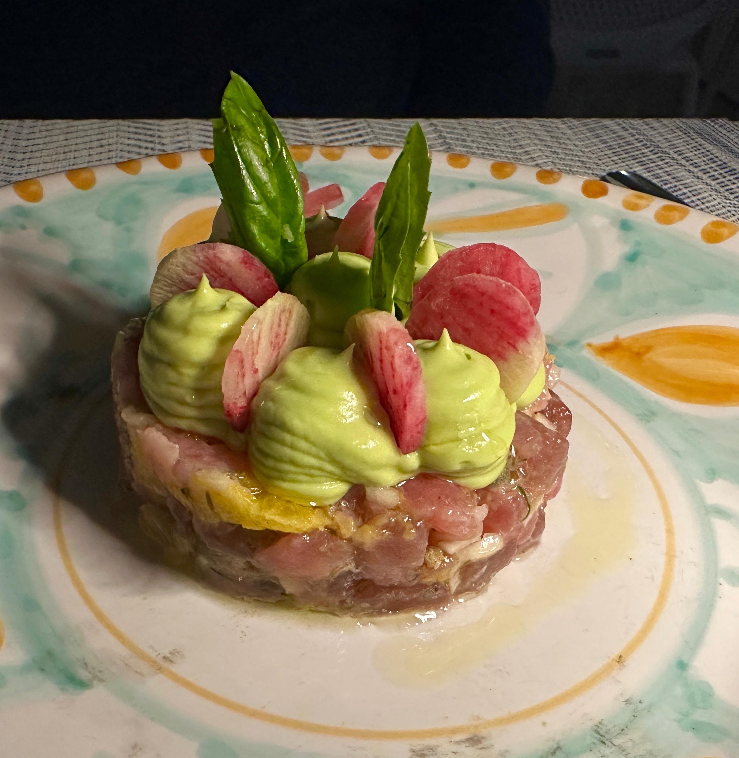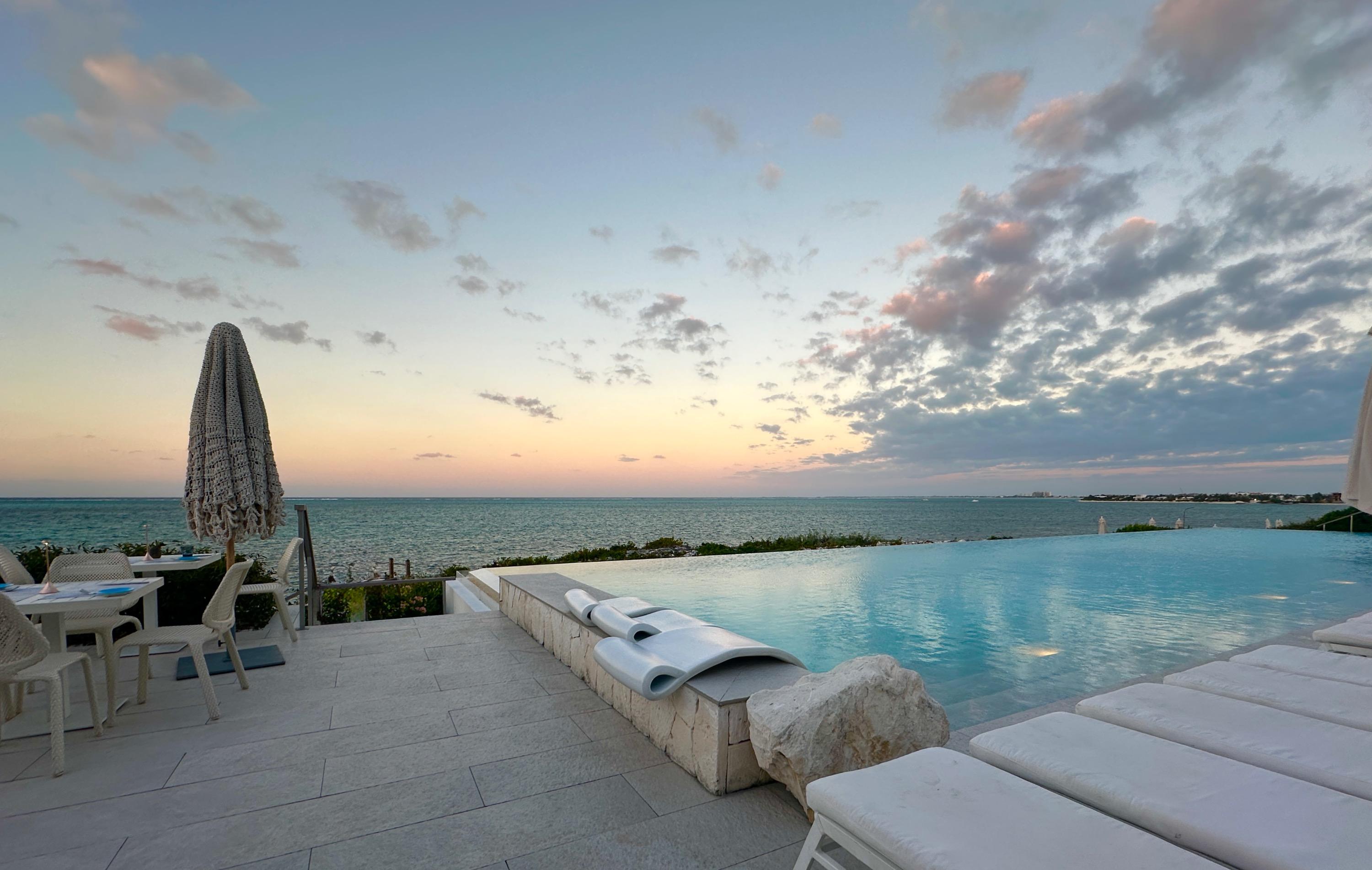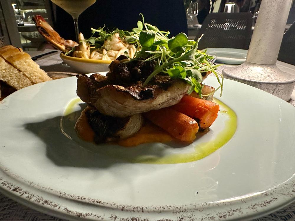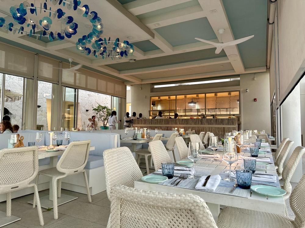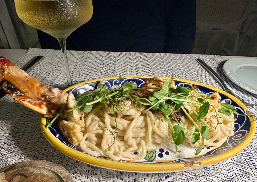 They were terrific. Not greasy, spicy, and full of conch. We also bought a slice of their key lime pie to bring home. I had it for breakfast this morning 😀 Yesterday we went for one last walk on Taylor Bay We found a big flame box crab hanging out on the shore Last night was supposed to be our last night on the island, so we booked dinner at Vita at Rockhouse, which is known for its spectacular setting. It’s built into cliffs, which makes it unlike the other properties on Turks and Caicos. It’s certainly beautiful. Here’s the view from the pool deck The menu Cocktail/mocktail And the restaurant. It filled to capacity moments after I snapped this picture. I had the zucchini Parmesan for an appetizer. It was so light Husband had the tuna tartare He he chose the lemon lobster spaghetti for his main And I had the snapper. The moment my entree arrived I was joined by a guest. This is Rocky, the mascot of the Rockhouse. He must like snapper because he sat next to me the entire dinner. He considered jumping up in my lap a few times, but settled for batting my leg to try and get me to feed him 🤣 I was told by our server that feeding Rocky is definitely allowed, so he got some of my snapper after all 🤣 We shared a pistachio affogato for dessert The weather back home is terrible, with 40-50 mph wind gusts and -20 real feel, so we decided to extend our vacation a few days. We had to leave the rental house, so are now at the Grace Bay Club for a few days. When we arrived to check in this morning there were two parties ahead of us that were also scheduled to go out on our flight home and changed their minds. I guess we were not the only ones with this idea!