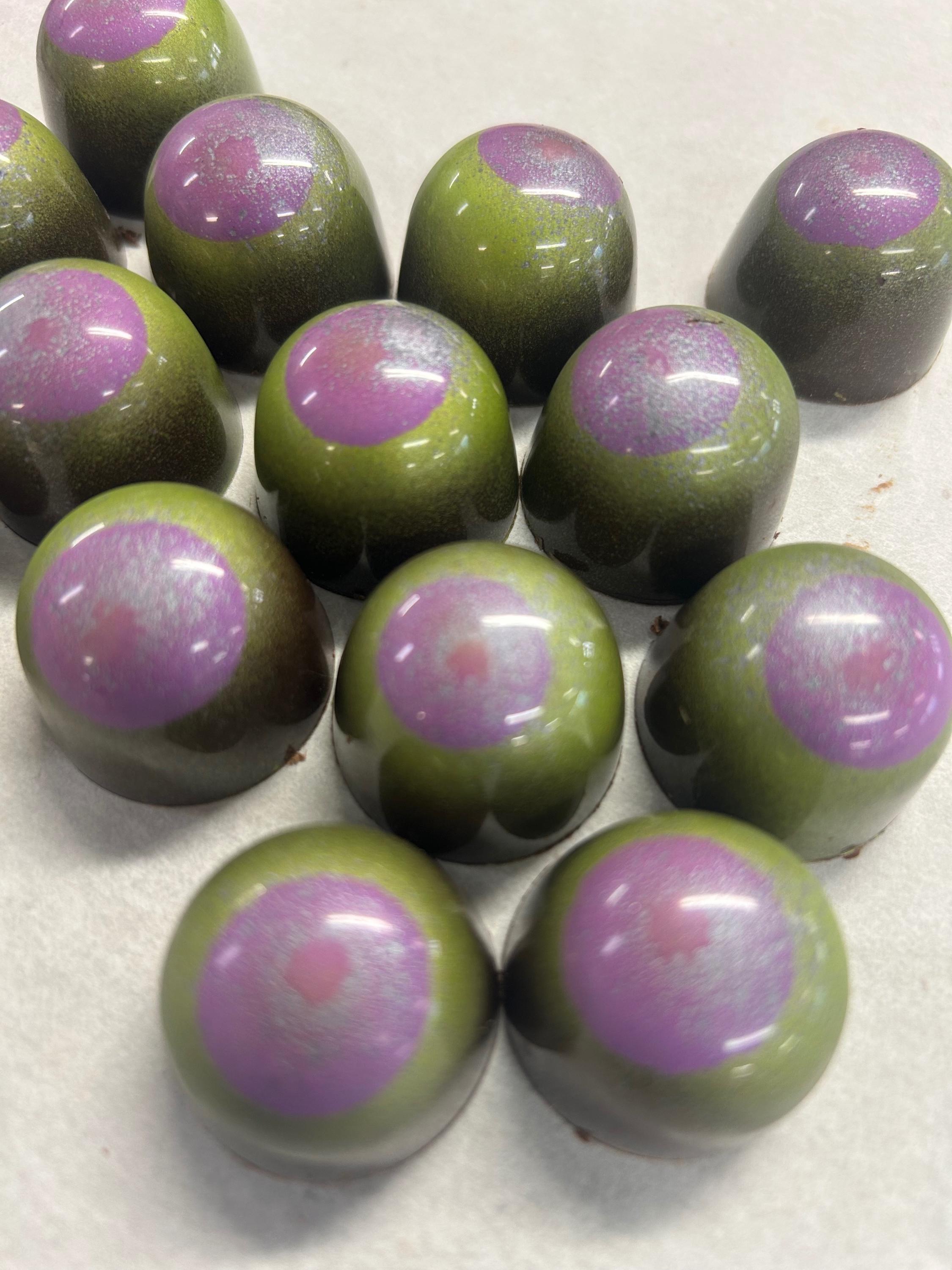 These were boggling my brain this morning - the bald patch/pupil is not supposed to be there but is perfectly shiny and there is no cocoa butter stuck in the molds. I splattered silver, sprayed the dot of purple then backed with green. My guess is the center bit of silver wasn’t set and the purple blew it away? Some variation in paint placement is usually ok as long as they’re shiny but these are bugging me. Would you use or re-make? -