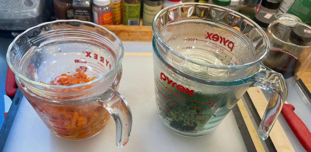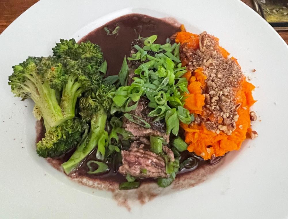 Dinner # 4 : and checking on the TB : This was 4 dinners , as I cut the TB ( 20.4 oz ) into 4 portions . The carrots were on bag of ' babies ' Broccoli 2 large heads. as an aside the carrots ( re-heated ) and broccoli -first time around. the broccoli for me was fine 2 1/2 min micro , trimmed a little , cold from the refig. the carrots did fine @ 2 minutes . but there were still a little wet . not as much as dinner # 1. I also pan sauted the TB 3:30 min each side , 30 seconds more . still a tinge rare , but not vey very rare . and improvement . I learned a lot , and once i get the carrots under control, a tasty winner for me. I thought i iPot'd them , pressure steam HP , from the refrigerator , 4 min. but I didnt keep track in The Red Book ( engineering lined ) , my Bad. the ref's I pulled up suggested 2 min HP seam , quick release . the outer 1/2 was cooked , a little wet , and the inner still a bit firm, , at what ever time I used. next bag : Ill pull the carrots out , quickly rinse in cold water , then pat dry and put under a preheated CSO broiler to both dry out a bit , get a little color , and finish cooking the core. tasty each dinner was , w significant improvement over the 4.
