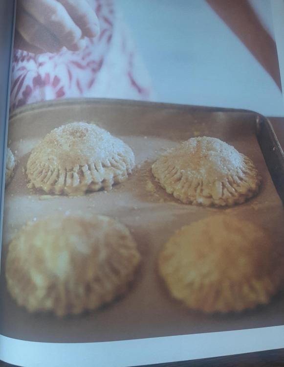 I went into my favorite local kitchen store, mostly to get coffee but also to browse. I came out with this book: This is foolish, I told myself. I haven't done sourdough in years, I told myself. I haven't baked bread in years, I told myself. But take a look at these ideas and photos! For apple-cheddar hand pies there's this photo (recipe on preceding pages): Maybe this will give me some guidance that I can share for savory hand pies. Hey, a girl can dream, right? 😃