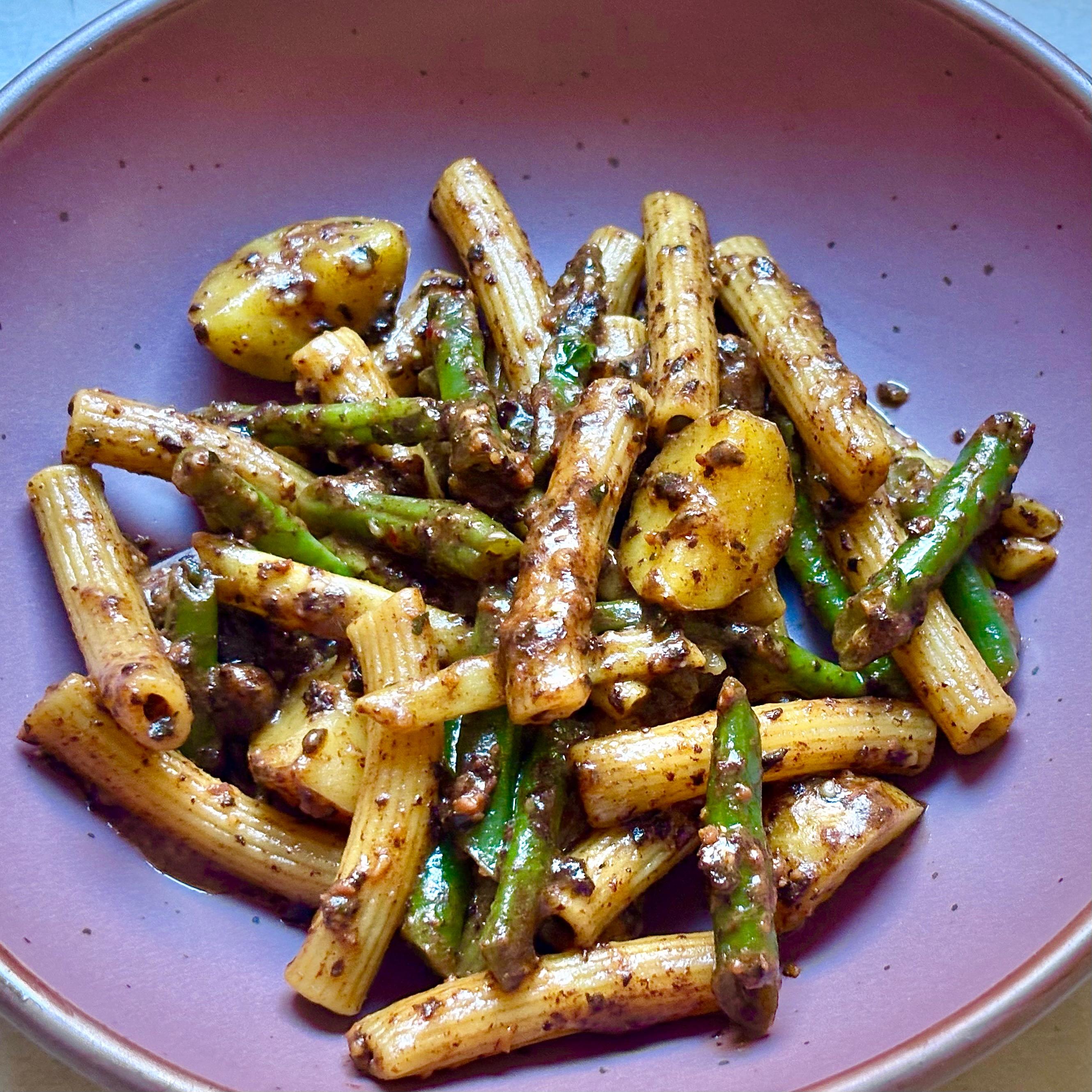 Picking up Six Seasons of Pasta after a little break, I used the Etto brand sedani I recently got bought to make the pasta with new potatoes, green beans and sun-dried tomato and almond pesto. Cooking the potatoes, beans and pasta sequentially in the same pot of salted water was efficient and gave the potatoes time to absorb the pesto flavors. This would actually be a great potato & green bean dish even without the pasta. If you like a little veg with each bite of pasta as I do, I recommend at least doubling the beans. I made a half recipe with lots of extra beans for 2 generous servings. I didn’t need all the pesto to make it as saucy as I wanted.