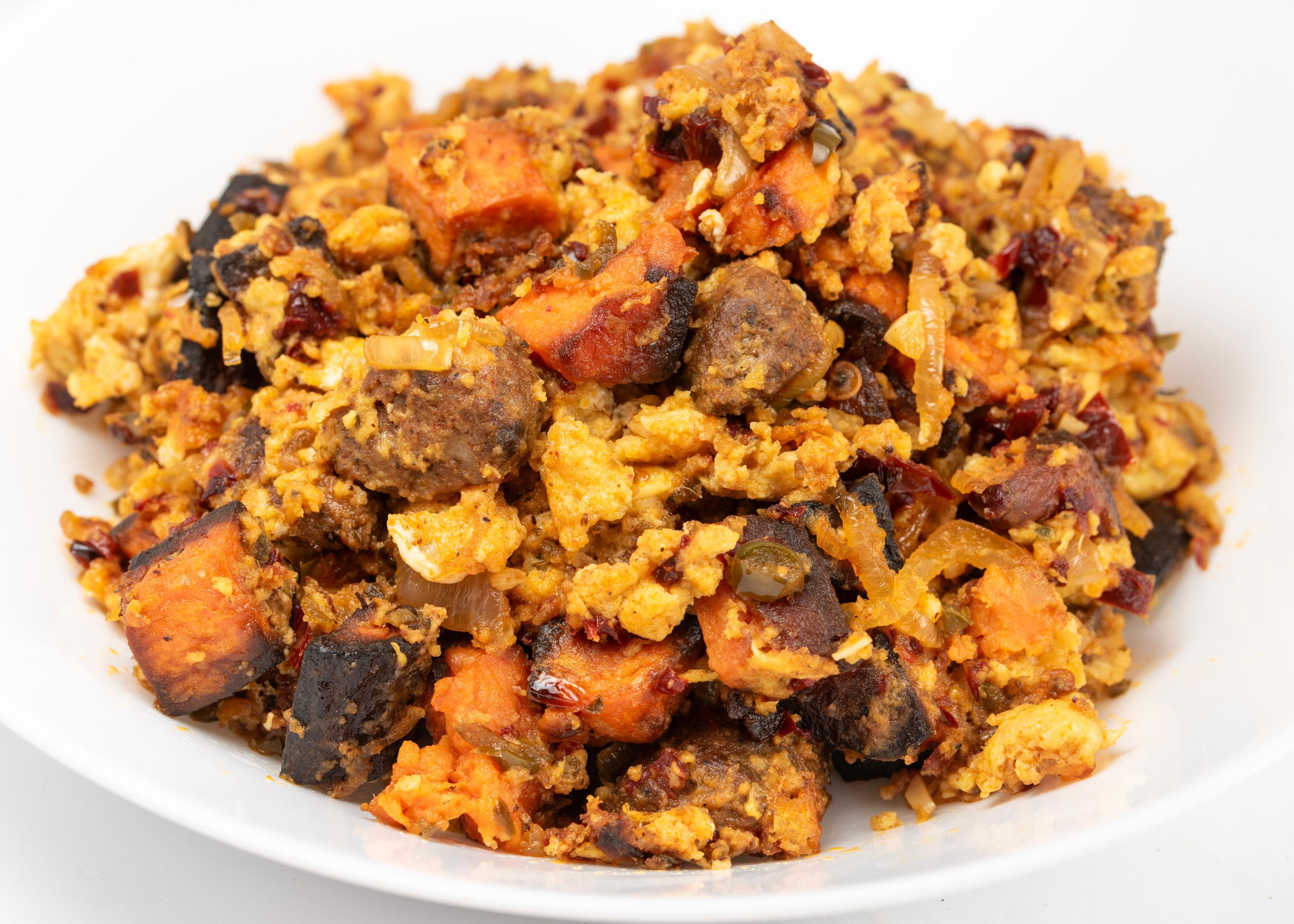Scrambled eggs with chorizo, (over-enthusiastically) roasted sweet potato, chipotle in adobo, shallot, and garlic. Yogurt for richness, cumin and Mexican oregano for aroma.