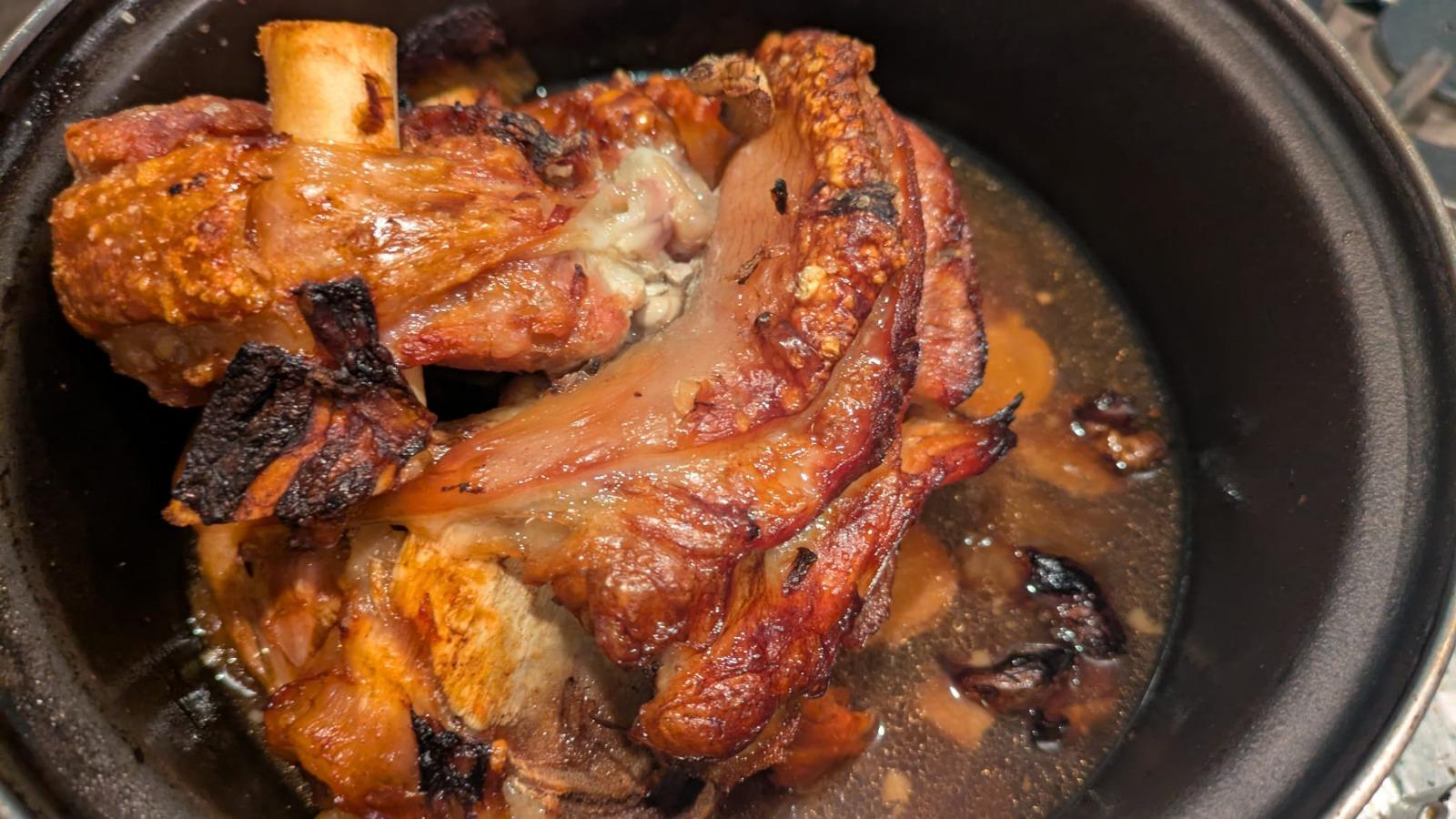 Pork hock with soy sauce, white wine, garlic, onions, ginger, allulose, star anise and cloves. I wish there were an animal built of fat, collagen and rinds alone; but apart from meself, I know no other.