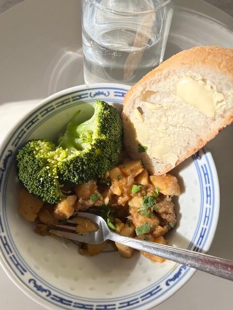 This was a small lamb Balinese curry using the paste from a jar of Ayam Balinese curry paste. Added onions, lamb and small pieces of potato and cooked for quite awhile till the potatoes were soft and creamy. I like this curry flavour, it is milder than most and not coconut milk based. Broccoli as a side and served with a slice of bread rather than rice!!