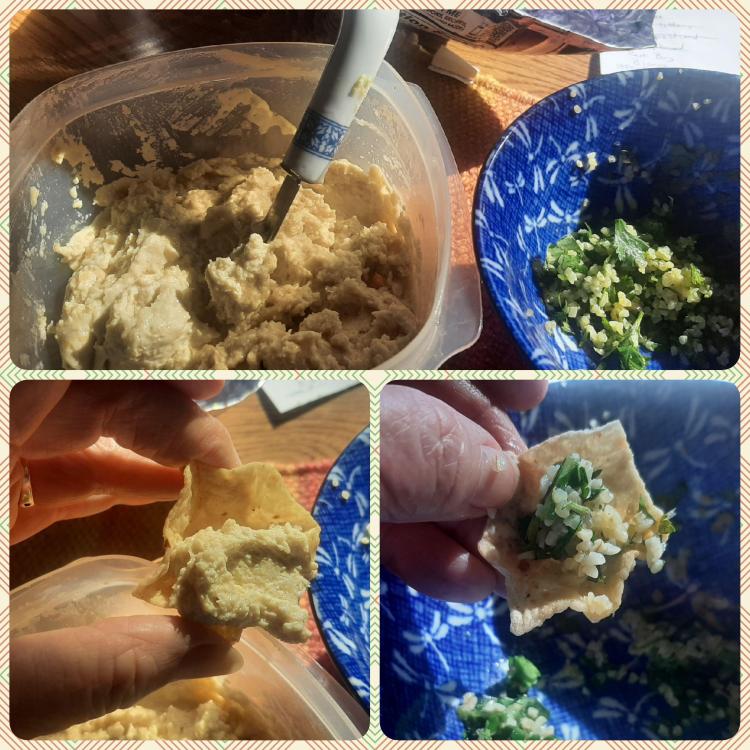 After months -- maybe a year or more? -- of not making hummus or tabbouli due to a mental burnout, I got back to it yesterday and today. The impetus for the hummus was a half-can of cooked chickpeas sitting in the refrigerator. I hadn't frozen them and was afraid that they'd start going off as had a bunch of other stuff in the refrigerator. I was too lazy to dig out a food processor or blender, so tried mashing them by hand. With a fork. And then stirring in tahini, water, and lemon juice with some salt until I thought I had it about right. I am AMAZED at how much those little devils swelled up; what began as a cup or less of cooked chickpeas became more than a pint of hummus. And no, it isn't as smooth as if I'd used a food processor, but it's just fine. The tabbouli -- well, I confess to having bought several bunches of parsley and cilantro and keeping it too long. This time, I used it before it could go off. The mint came from my garden. I could thin that hummus even more, but I'm pretty happy with it as it is. And I'm happy scooping it all with Tostitos Scoops. It's late afternoon. This may be dinner as well as lunch.
