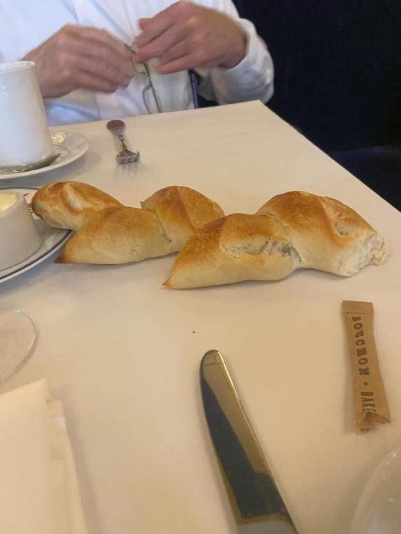 I'm fixing to develop a copycat of the Bouchon "rolls" they serve (warm) with brunch. looks like: two issues: 1 - the bread itself 2 - the technique at first I thought they did the scissors-snip thing to create the 'outcroppings' - but on closer exam it appears they make individual taper/torpedo shape rolls and overlap / glue them together & let rise . . . note also what looks to be the 'cut surface' . . . like each was cut on diagonal from one long baguette(?) then 'stuck together' the crust on these is not hard-crisp; the softer crisp could be an artifact of baking/holding at humidity? it's the crumb where I have no good experience. the crumb is fairly 'fine' - no big holes/etc ala 'good rustic bread' the texture is not soft/mushy like a typical 'dinner roll' - it's 'firm' - tears easily - stands up to a knife spreading butter&jam my thinking is a well machine kneaded baguette dough - thinking the extra kneading may produce a finer crumb. any ideas / experiences / advice along the line?