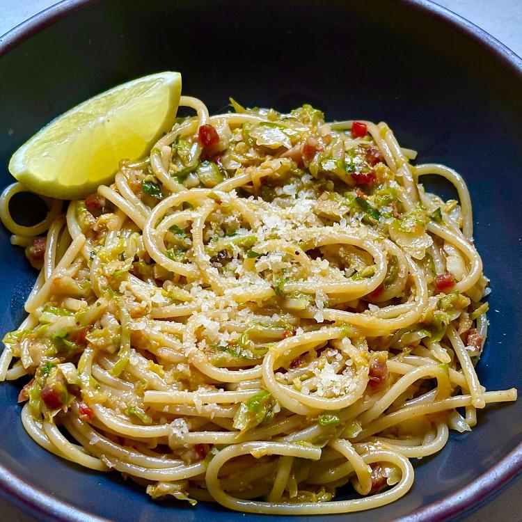 Spaghetti with cabbage, pancetta and Calabrian chile from Six Seasons of Pasta I made this with Brussels sprouts instead of cabbage and bomba sauce instead of oil-packed Calabrian chiles. Very homey flavors of cabbage and a little pork, perked up by the Calabrian chiles and a squeeze of lemon. I’ll make this again with cabbage but I think the sprouts were a fair substitute.