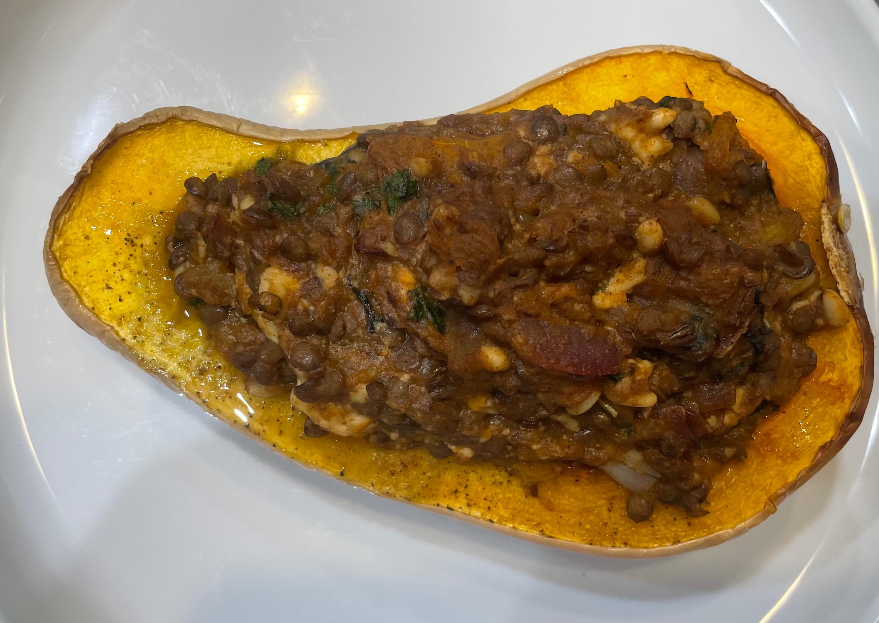 Roasted Butternut Squash Filled with Caramelized Puy Lentils and Feta from “Full of Flavor” by Maria Elia - butternut squash halfs get roasted in the oven with just some olive oil and scooped out. The squash flesh is cooked with caramelized onions, garlic, cooked puy lentils, feta, mint, parsley, pine nuts, cumin seeds & powder, paprika, sirarakhong chili powder and lemon juice, filled back into the butternut squash halves and baked in the oven. Normally you sprinkle pomegranate seeds before serving but they turned out to be bad