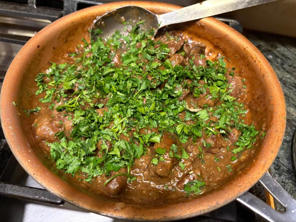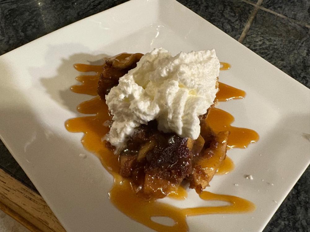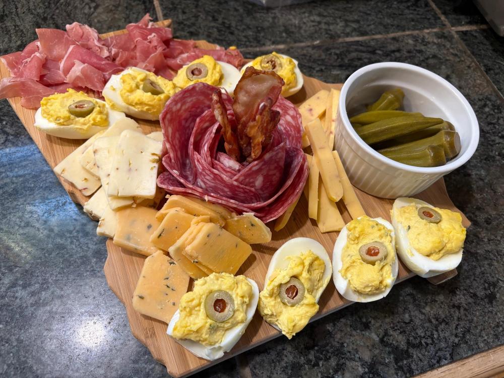 I've suspected that, too, but.....they've passed on everything so far. I'm proud of them. Maybe they are finally maturing 🤣. Our hunter friend leaves today (supposedly....his flight has already been delayed for some unknown reason) so I don't think anything will be gotten. We have another week of deer season plus there is a doe only season in January. We might just wait until then. It's actually kind of a relief not to have to clean a deer and package it etc. tomorrow. Thank you for keeping me company!! Lucky for me, Ronnie stopped on his way to pick up our friend and picked up some on sale choice steaks. Last night was a much easier evening for Shelby lol. But backing up, the usual Lipton's onion soup mix dip to eat while watching football yesterday afternoon. Then the guys went out (taking a portable tv with them for football watching). I threw another board together--this time using the Georgia shaped one in honor of the Bulldogs. The steaks went swimming in the SV bath. Meantime I baked some potatoes, roasted some asparagus, made some hollandaise sauce for said asparagus and deviled some goose and duck hearts and a few livers. As per usual I got a cast iron screaming hot to sear the steaks and dinner was done! Also, earlier, I pulled the last batch of apple pie filling I made from our apples and made a galette. A little whipped cream and caramel to go on top. So.....I have pork chops in mind for Ronnie and I for dinner tonight....I might thaw out another two just in case our friends flight gets cancelled or something......that's never happened before. Anyway, the guys are out putzing around in the garage. Football starts in a couple hours so that should keep them occupied for a while lol. Thanks for hanging out with me--as always, I enjoy you guys a lot