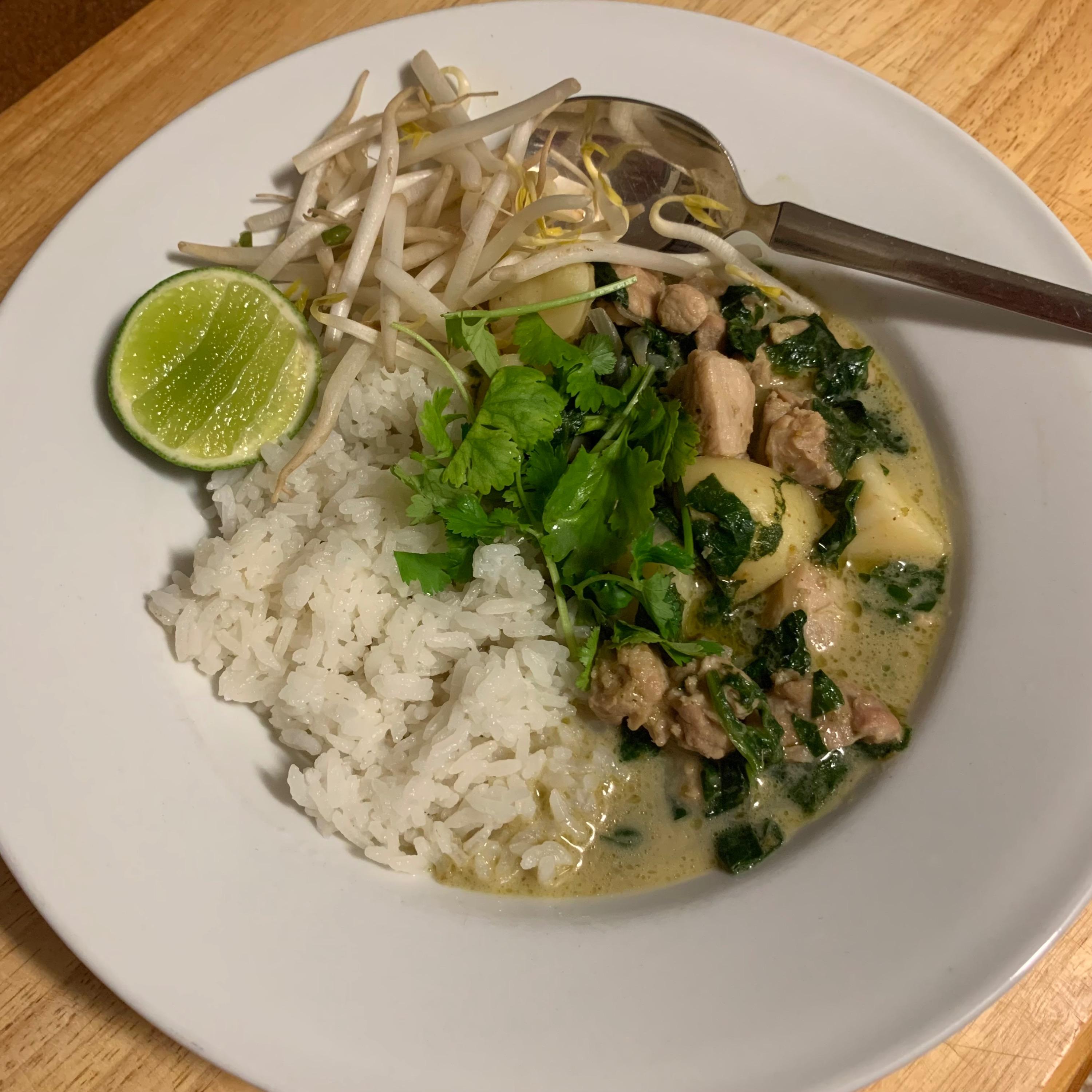 There is virtually nothing authentic about this Thai green chicken curry, but it’s how we like it with potatoes and spinach.