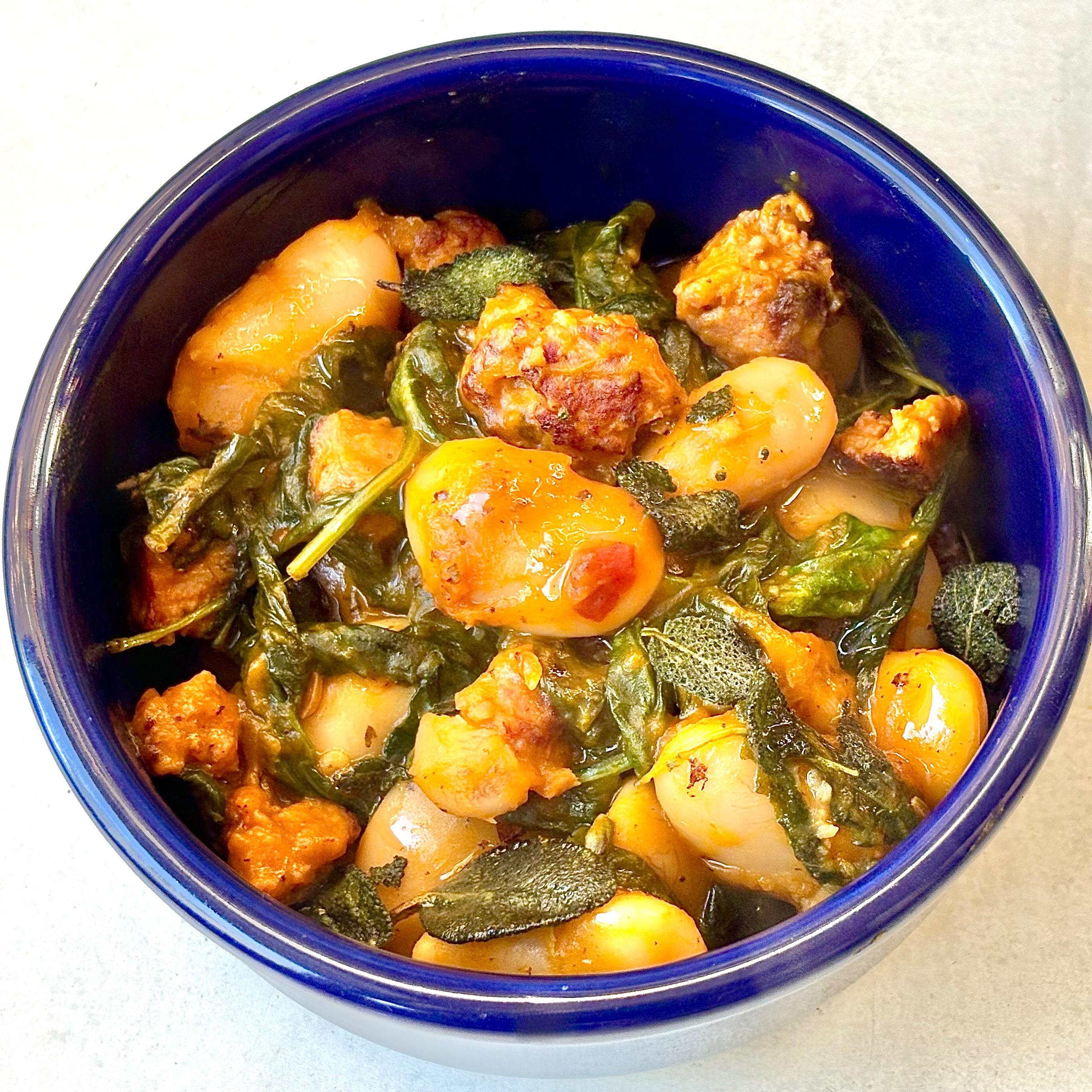 Yesterday’s breakfast was green eggs & ham on a ciabatta roll, an idea I stole from Joe Sasto’s recent cookbook, Breaking the Rules which I borrowed from the library. His version is eggs, scrambled with pesto, piled on toast and topped with crisped up slices of salami. I browned a slice of Canadian bacon instead of the salami and put it on the bottom, though it’s kind of invisible in the photo. Not bad. Today, I made a bean version of the pasta with butternut squash, sausage, sage, and spicy chiles from Six Seasons of Pasta using Rancho Gordo Royal Corona beans instead of pasta. I also added a big handful of baby kale. This was really good for a chilly morning. I used bean cooking broth instead of pasta water to bring things together.