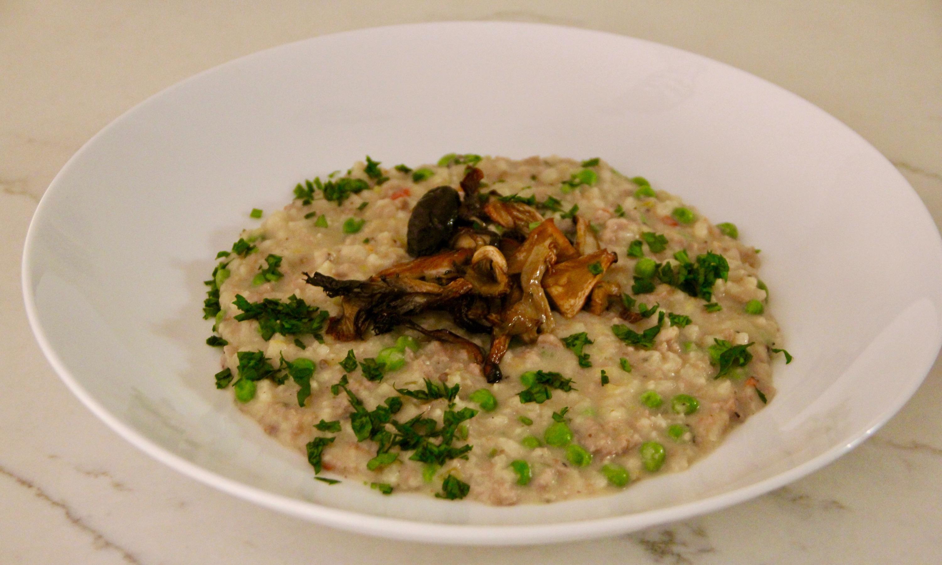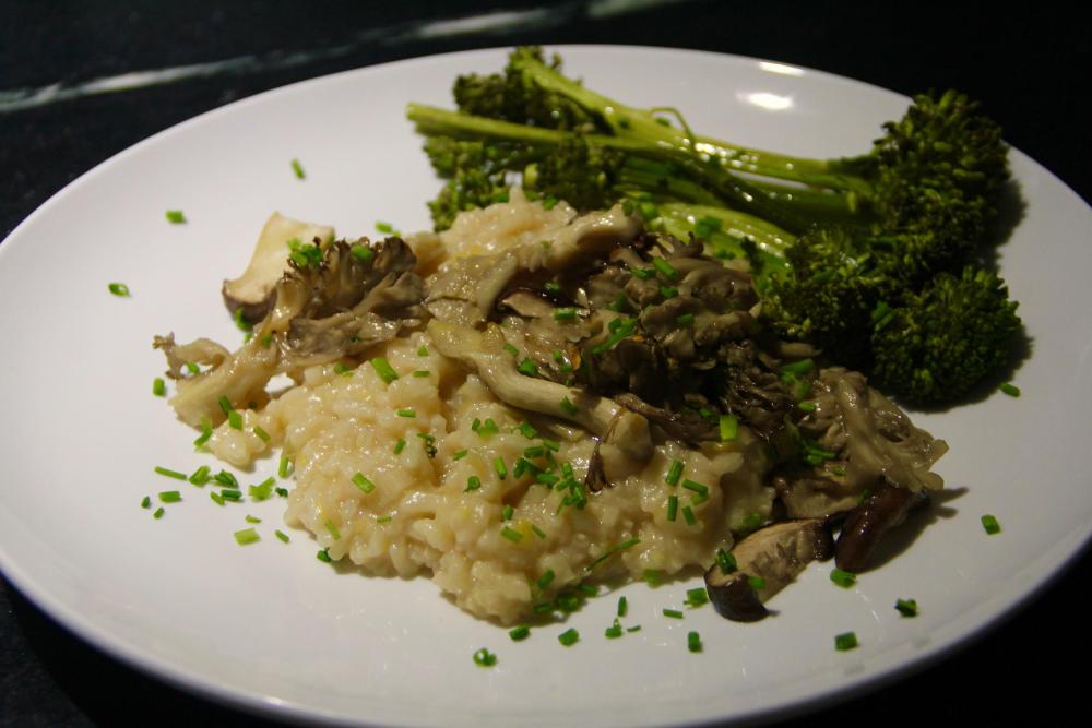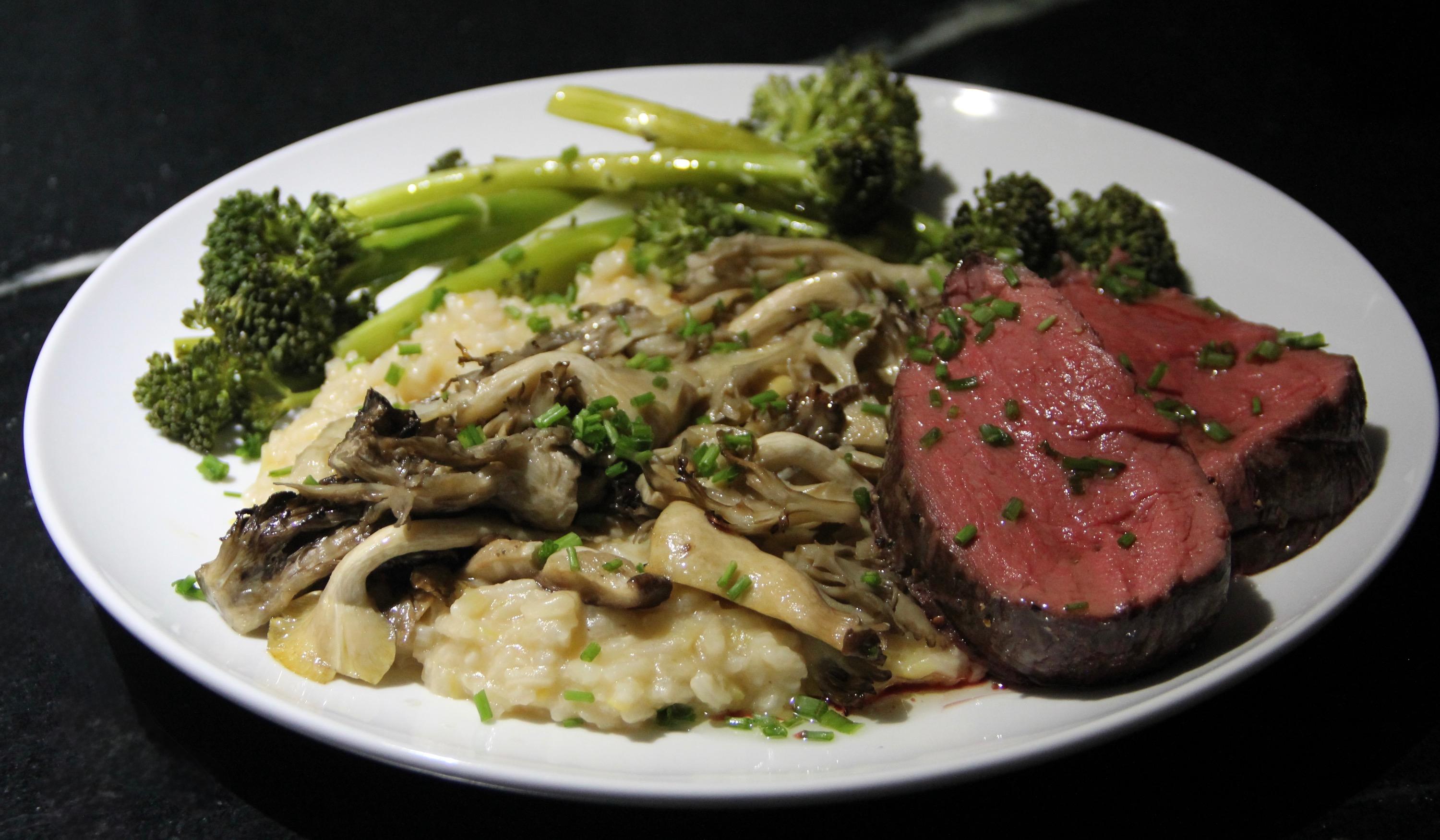 Christmas dinner was risotto with roasted broccolini, wild mushrooms and slow roasted beef tenderloin The vegetarian version for my sister and me A simple chicken and bell pepper stir fry for the 26th And last night I didn’t feel like cooking much so just took the leftover Christmas risotto and reheated it with added peas, ground sautéed chicken sausage, and the leftover wild mushrooms, roasted until crispy