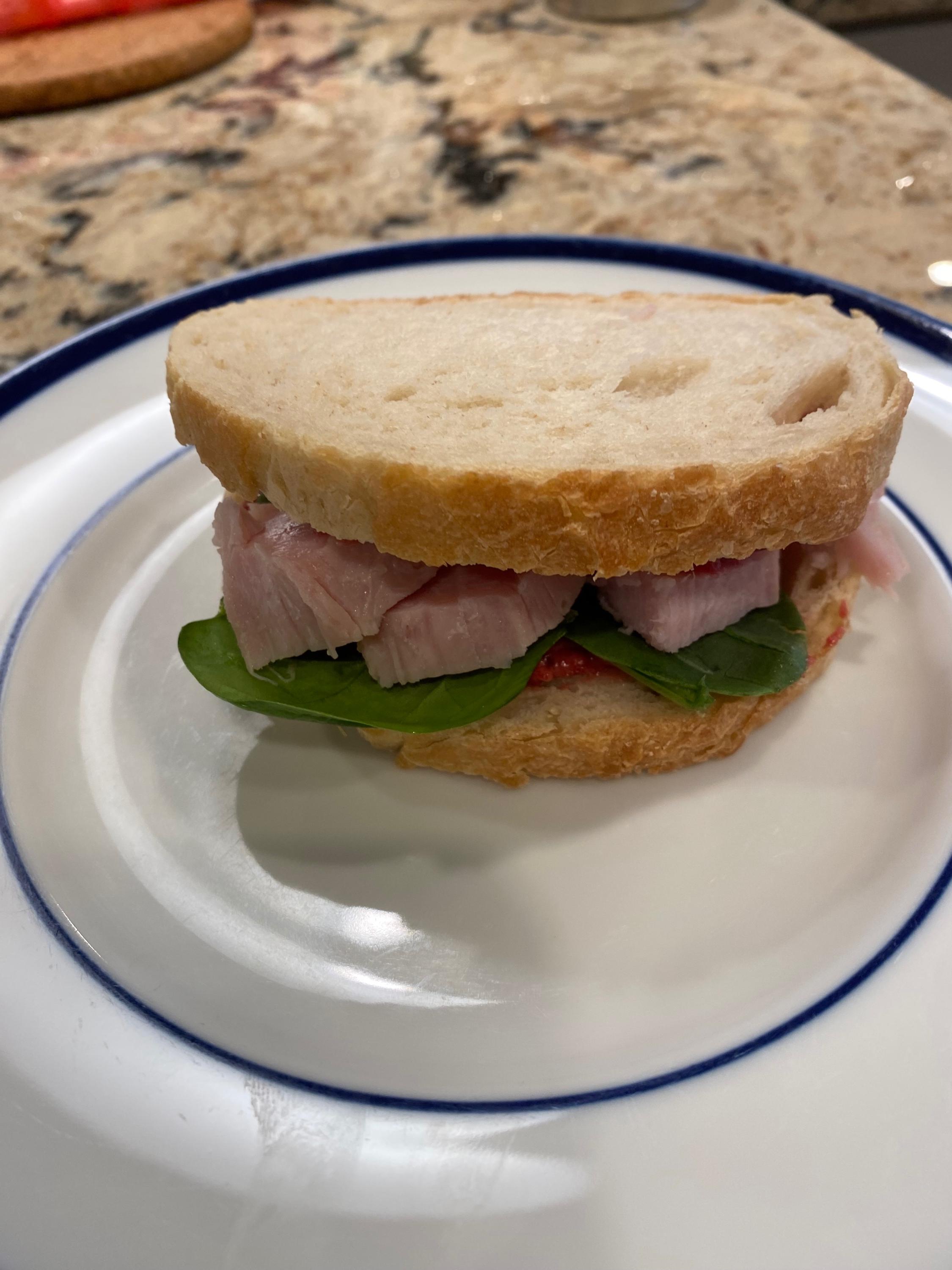 Leftover smoked turkey with cranberry mayo and some greens. I’m he latest of many. We overbought on turkey