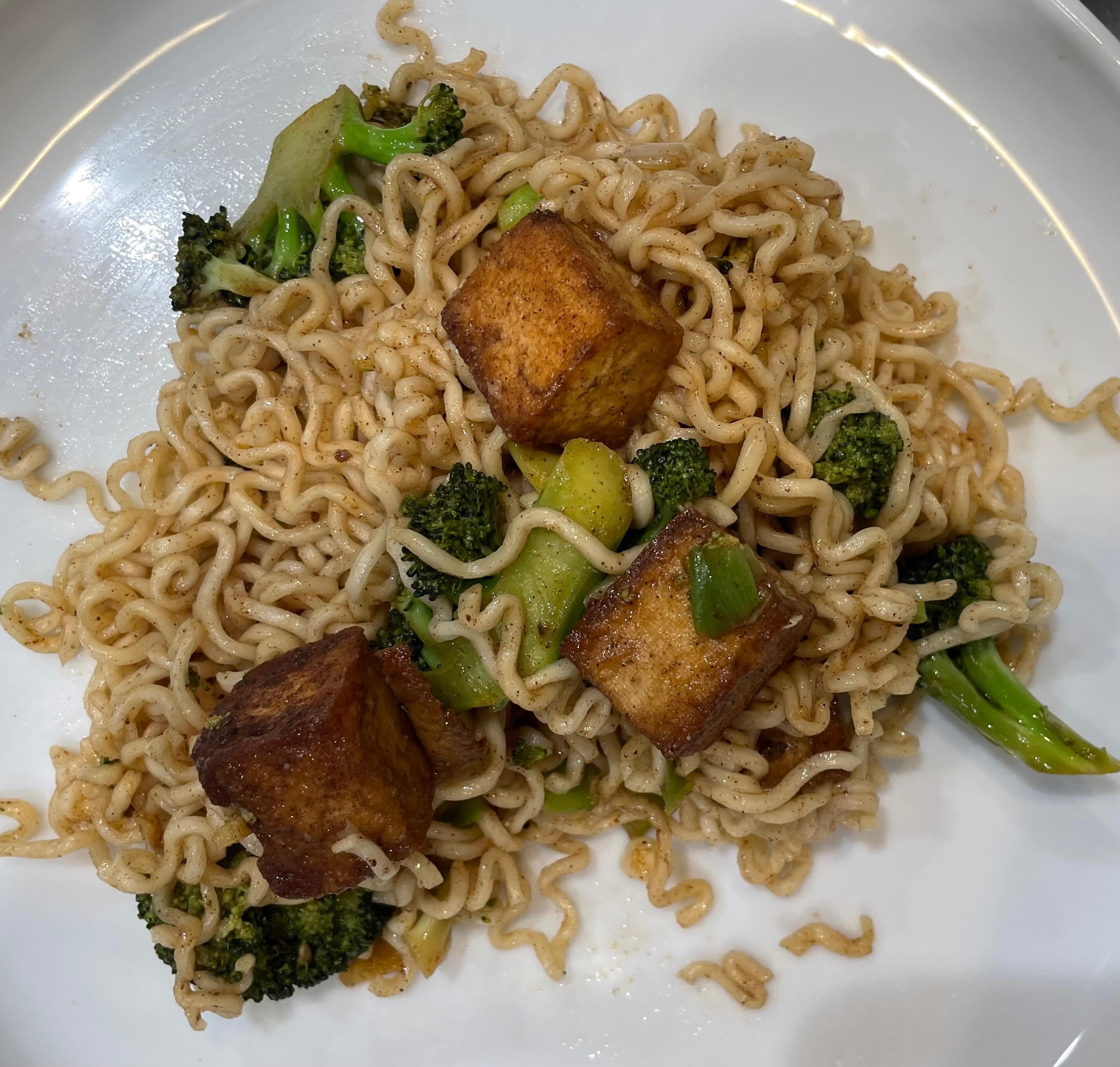 Five Spice Noodles with Tofu and Broccoli - baked tofu is dusted with five-spice powder and pan-seared until browned. In the same pan you sauté broccoli, garlic and ginger and add a sauce made from soy sauce, sriracha, mirin, lemon juice and corn starch. Once the broccoli is tender you add lo mein noodles, scallions and the seared tofu
