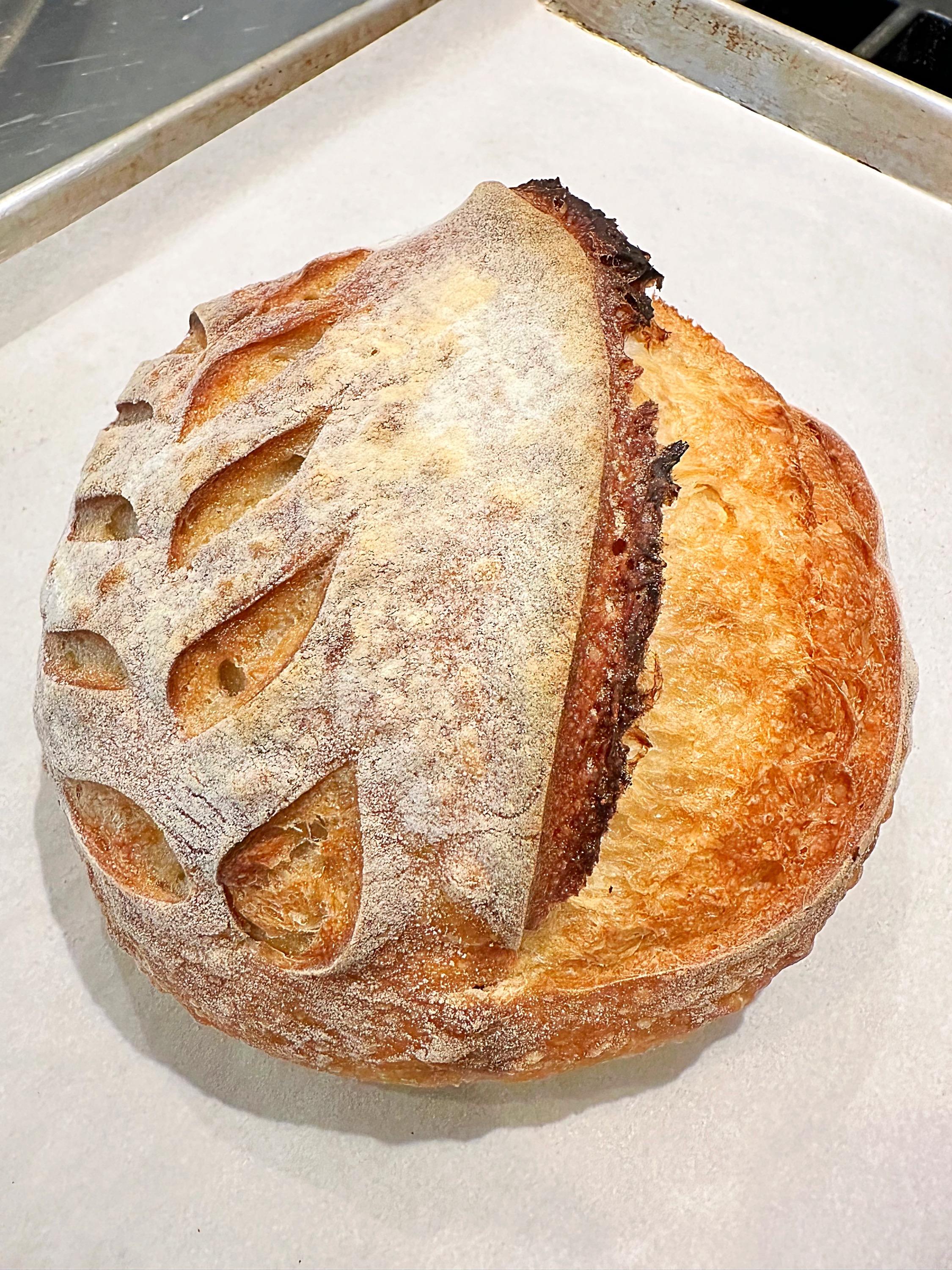 "Das Ultimative Sauerteigbrot," recipe from Rene Dasbeck (https://www.brooot.de/weizenbrote/das-ultimative-sauerteigbrot/?fbclid=IwY2xjawN2XQVleHRuA2FlbQIxMABicmlkETFmZDQ0dXFLZVRZbnlySVZuAR6hdP13QyH-HhP9AdzvLk-AfgyuXpbVn9A_CDxbzA1oBZZXDMvxB4ouTVqCKw_aem_KdbnKjzYidqkmIDMHPC5qQ&brid=1mib5OTjoleHhLhjZdlu9A). Nice in that it has a relatively small amount of pre-ferment, and a touch of beet syrup. Very aromatic, as he indicates, a pleasant everyday levain.