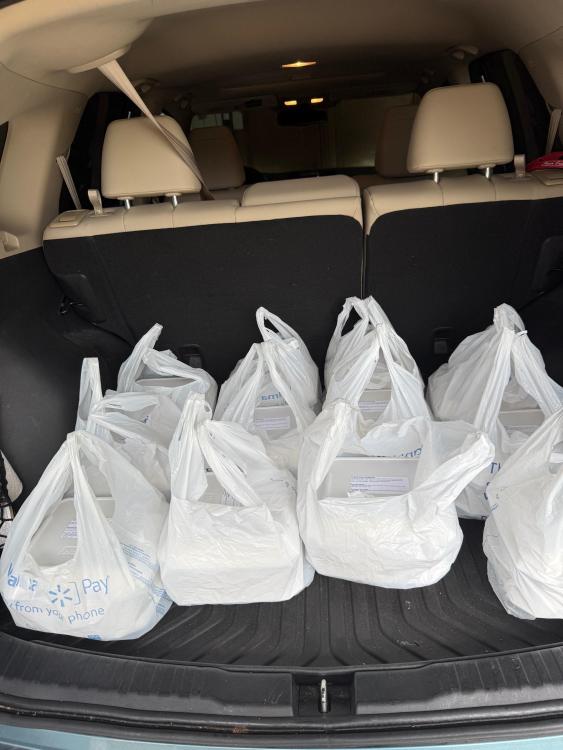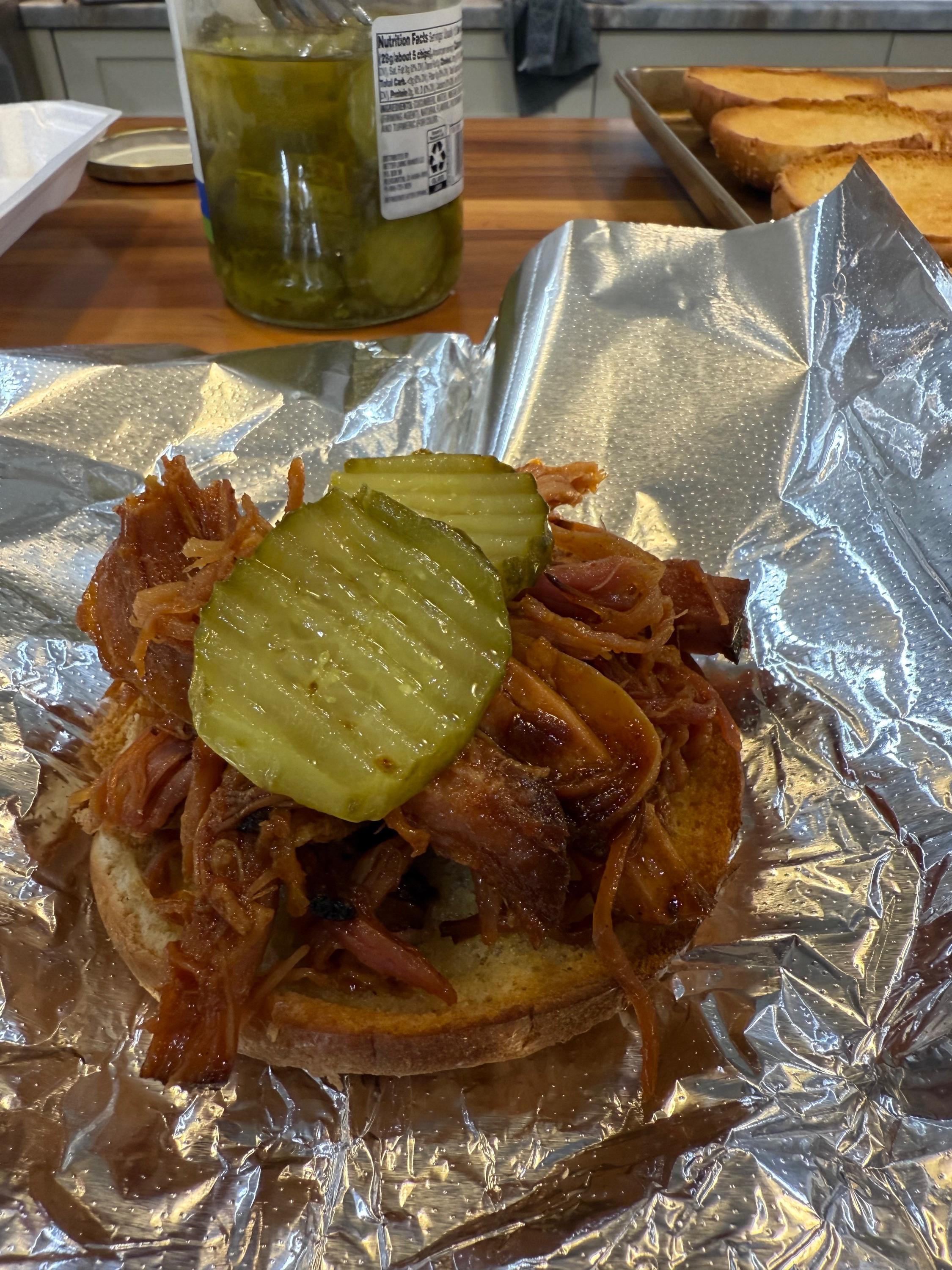 Sorry it has taken me so long to post about this CFM! Christmas week was jam packed and I had a couple of moments of high anxiety, wondering if I’d get it all done. On Tuesday morning, I started with two bone in hams. They were coated in mustard and a homemade rub. I poured a 12 oz bottle of Coke in the bottom of each pan, covered them tightly in foil, and then two hours in the oven at 275. Removed from the oven and covered in a combination of Sweet Baby Ray’s barbecue sauce, apricot preserves, and apple cider vinegar, and back in the oven, with the temp raised to 300 degrees Fahrenheit. After the first two hours, as I was preparing to cover them in sauce. I thought they were done, but I was sadly mistaken (misunderstood the internal temp goal of 200 for pulled ham, vs 165 for “done” ham). So much to learn. Later that evening (hours later) it was pullable. Tasted good, too. The pulled ham sandwiches were accompanied by broccoli salad. (Thanks for the suggestion @Shelby!) My recipe calls for raisins, but I subbed with Craisins. Broccoli, bacon, cheddar, red onion, sunflower seeds, Craisins. My husband was turning his nose up at the broccoli salad from the beginning. (He is now a believer.) I made and dressed the broccoli salad on Tuesday for the Wednesday delivery. Before dressing: The dressing was made of mayo, sugar, red wine vinegar, salt, black pepper. Nothing unusual or edgy. I toasted the buns, and you can see that they are a beautiful color. Unfortunately, they were still a little over toasted and the sandwiches didn’t have any give. It made me sad. Maybe the chocolate chip cookies with flaky salt helped. I hope so. [ There was a family and two single guys waiting for food as we unloaded. I apologized for the over toasted buns and one of the single guys insisted he preferred crunchy bread. 😂 That was nice of him. I feel good that we were able to complete and deliver for 11am on Christmas Eve.