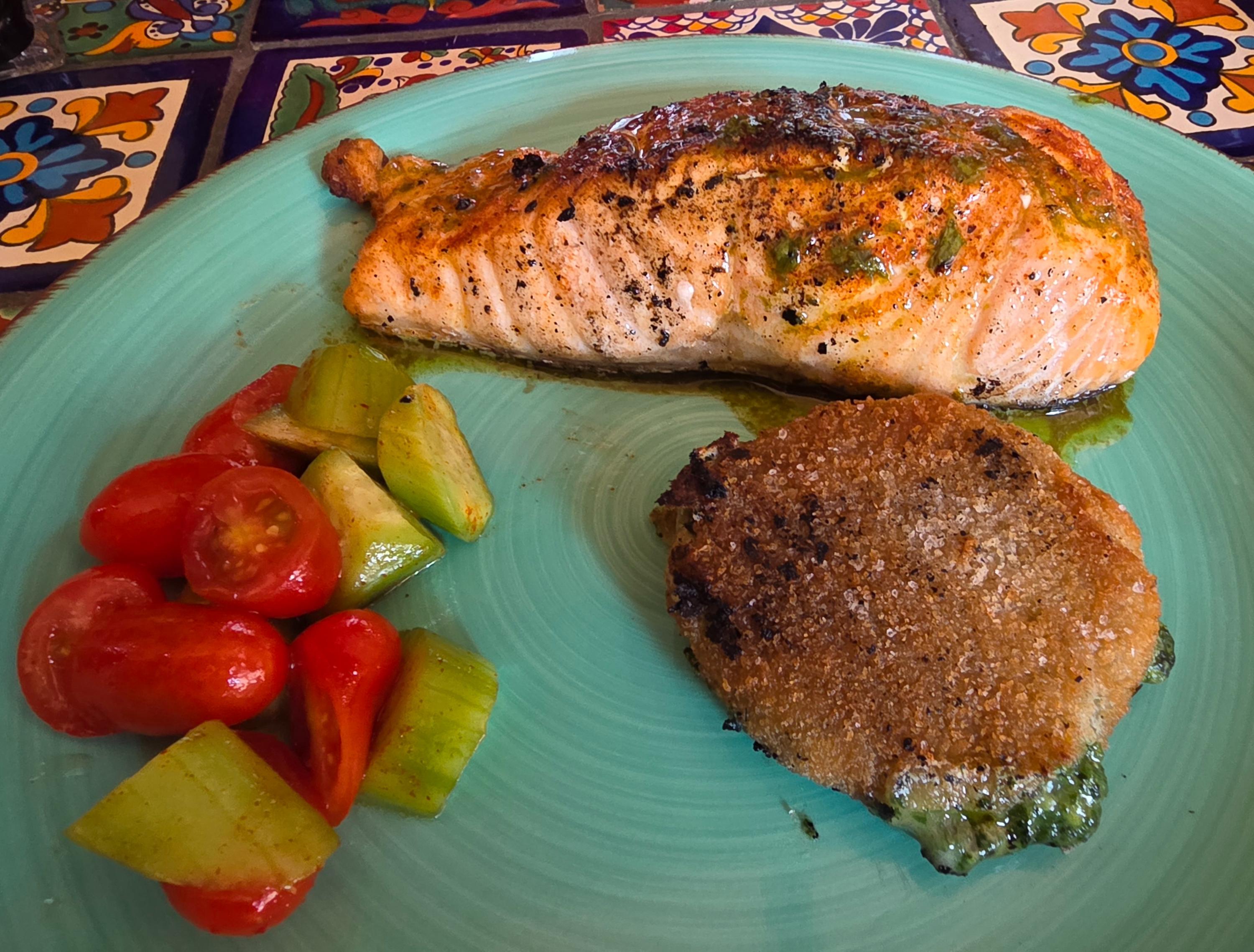 Grilled salmon with 'green' sauce. It was a puree of arugula and cilantro (4:1 in favor of arugula) with serrano chiles, garlic, lime and olive oil. Sides were chunked grape tomatoes and Persian cukes, along side of (store- bought frozen) fried breaded medallions of espinaca and queso.
