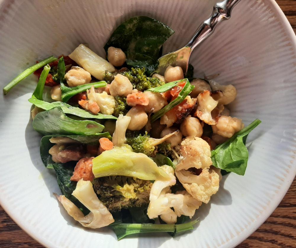 Lunch today is a very similar salad to yesterday's: roasted vegetables, cooked chickpeas, and (this is a change) a few bites of Juusto cheese, all gently reheated in the microwave oven, then tossed with spinach and dressed with the above-mentioned Creamy Sesame Ginger Dressing. What's especially interesting is that the dressing is even better now that it's had time to sit in the refrigerator overnight. What a delightful blend of flavors! (The rewarmed Juusto helps, too.)