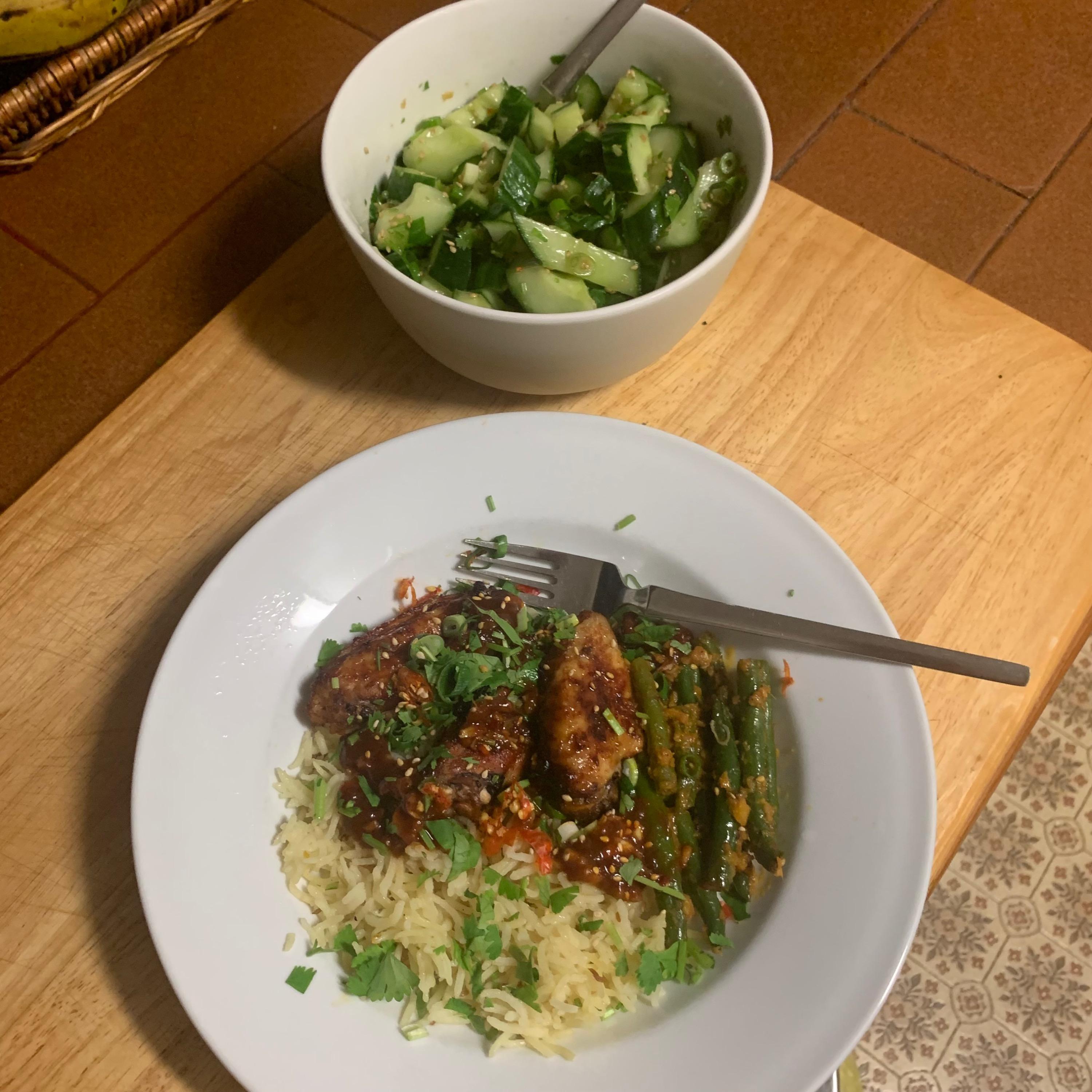 Dinner last night was spicy baked chicken wings, using a Nagi Maehashi recipe. I bolstered the chilli and reduced the sugar, as I usually do. Served with leftover rice, sesame green beans and her smashed cucumber salad (with the addition of chilli flakes).