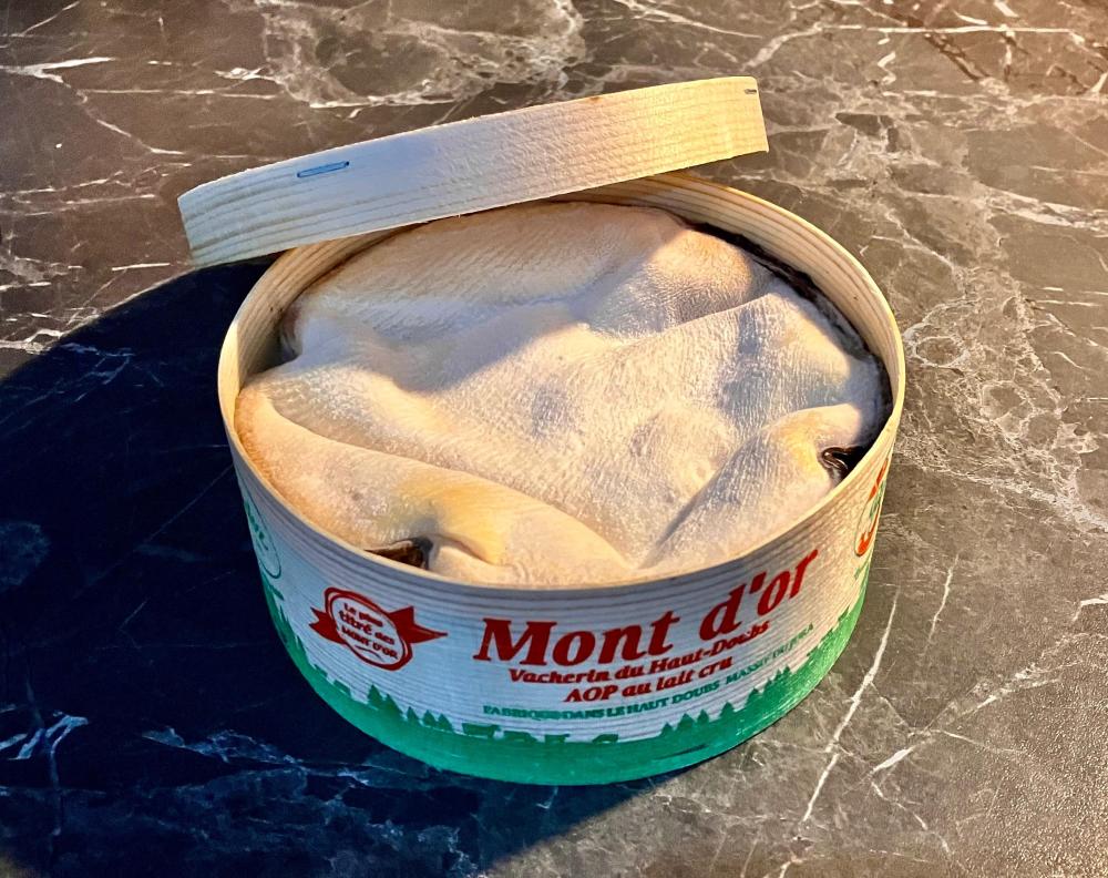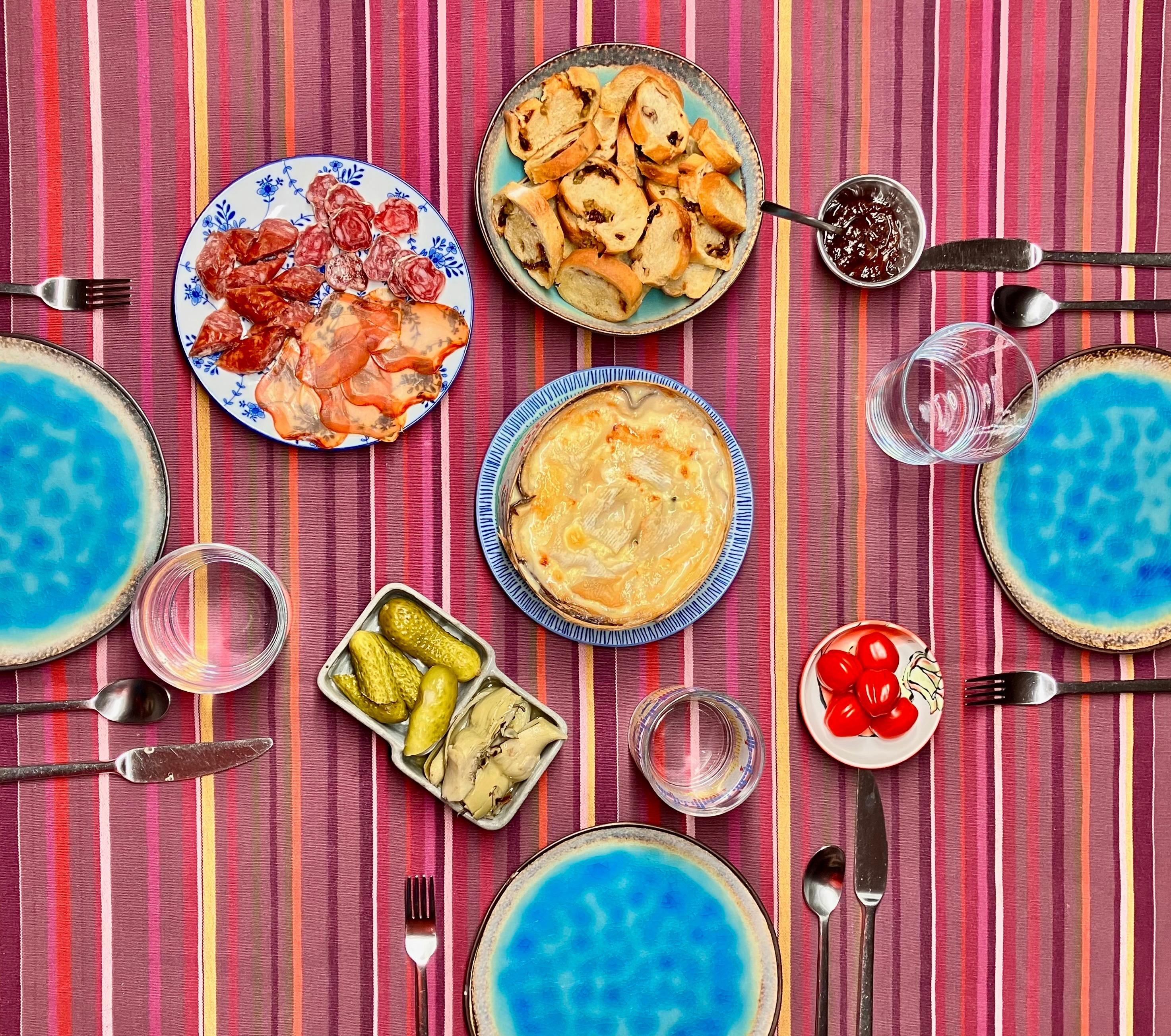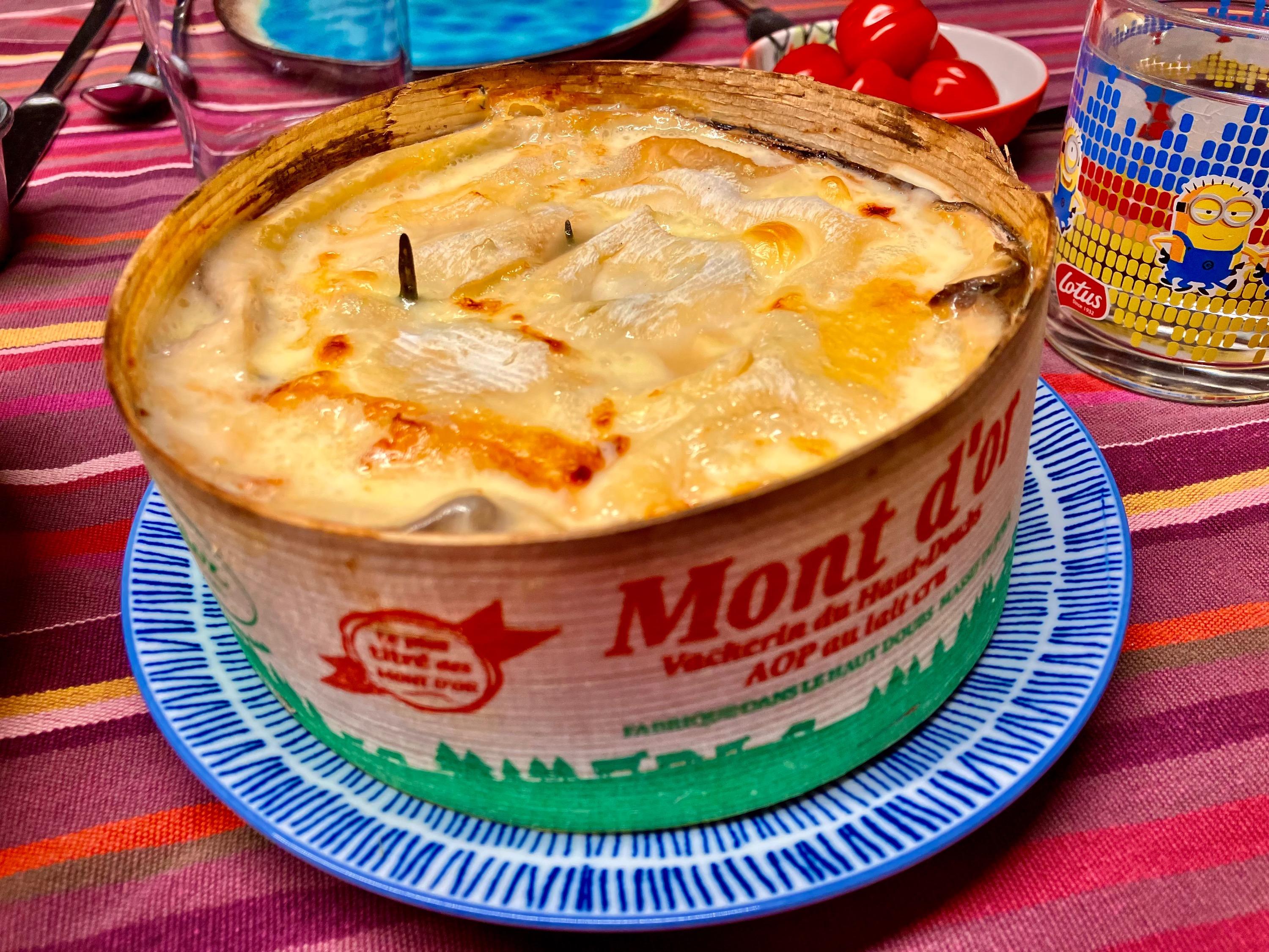 Beside all the cheeses served yesterday I also bought a lovely raw milk Vacherin Mont d’Or while stopping over in Besançon. As per tradition I removed part of the upper rind, added dry white wine, grated garlic and some rosemary (thyme would have been ok as well), “closed” it again and popped it into the hot oven for about 35 min … Glorious - instant cheese fondue, served with some cold cuts, roasted bread slices, pickles and (not traditional, but good) chutney. No complaints 🥳