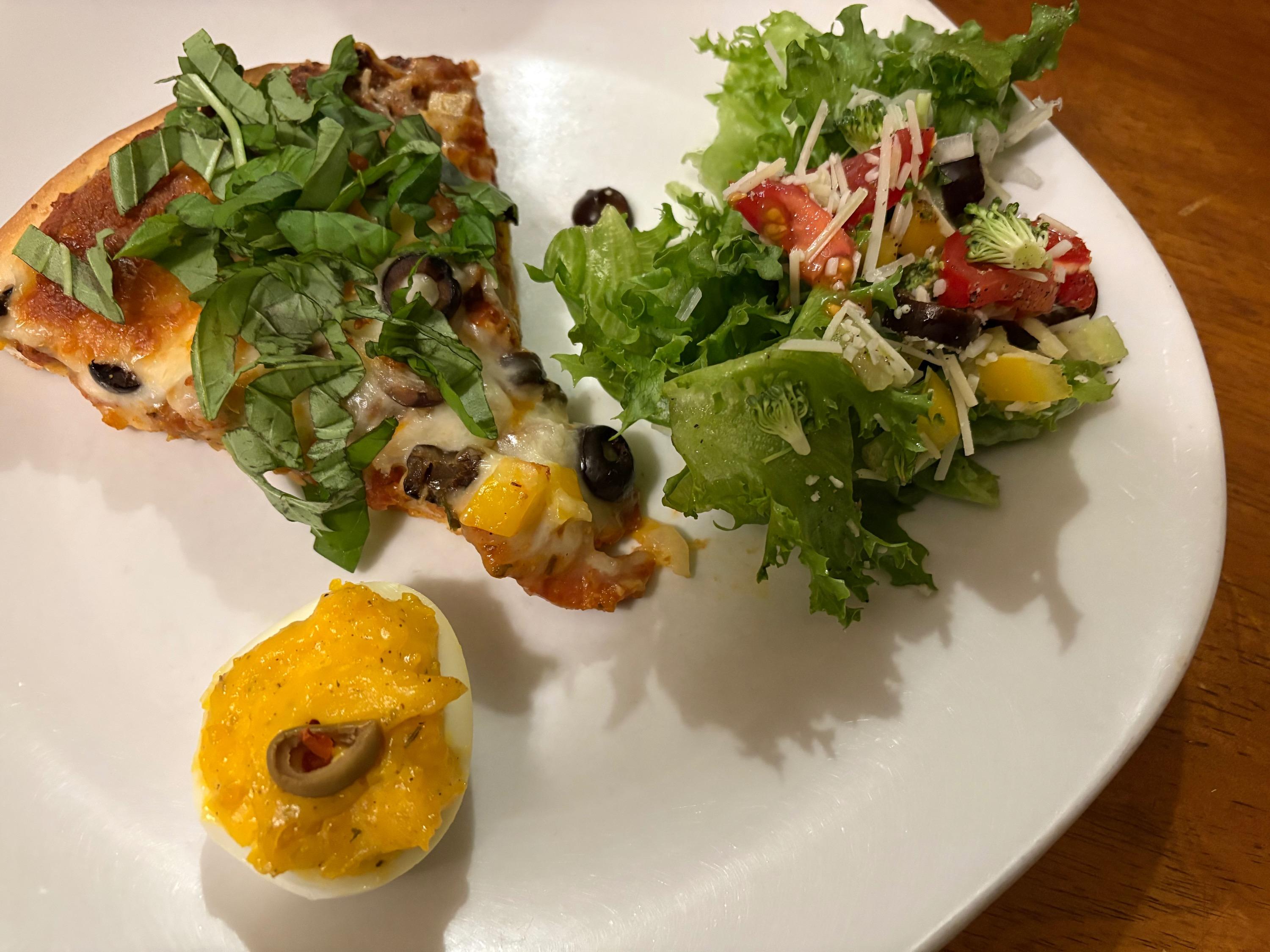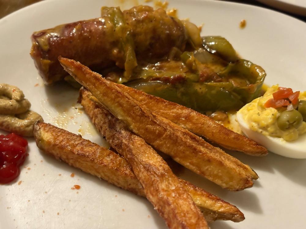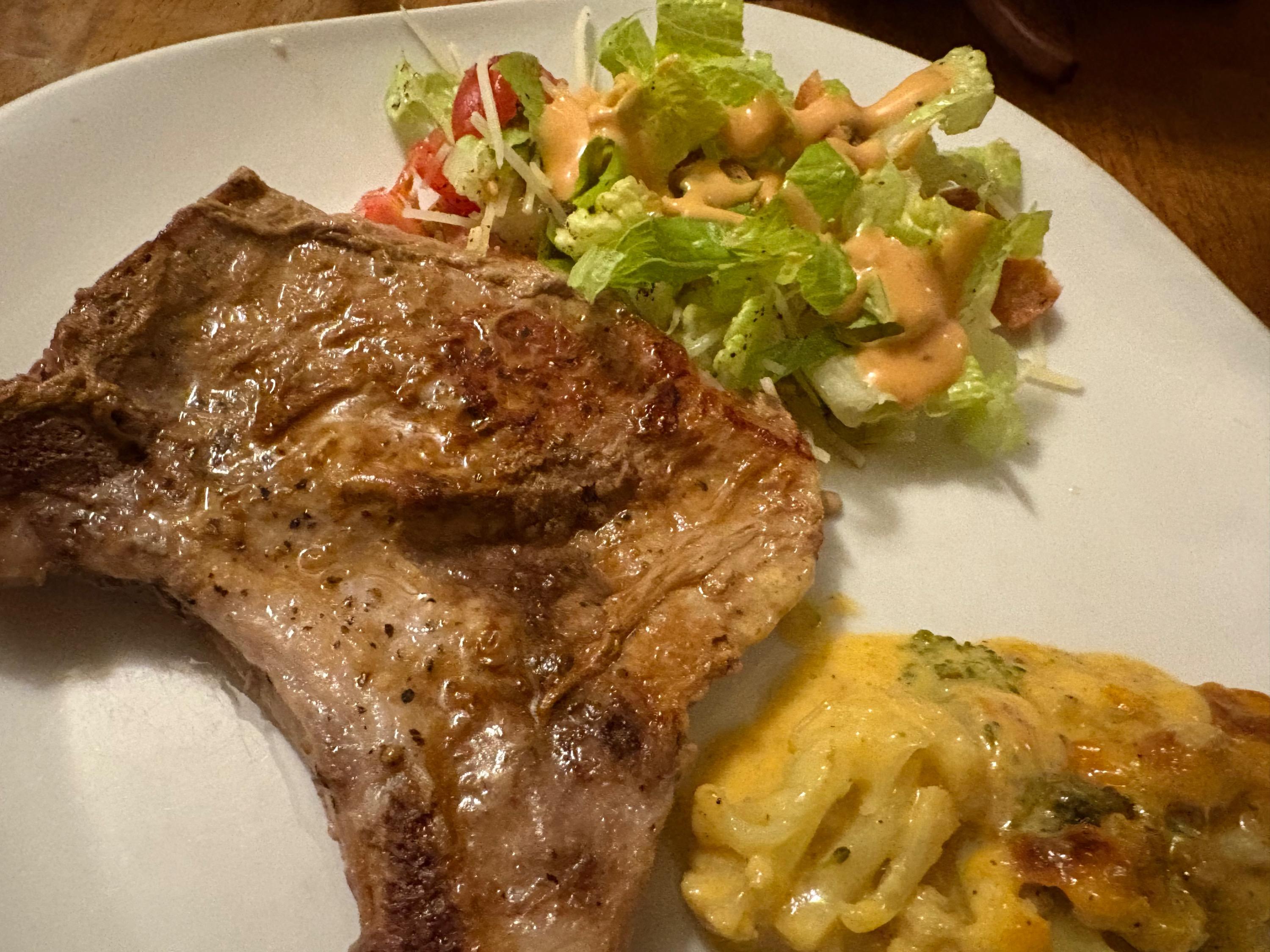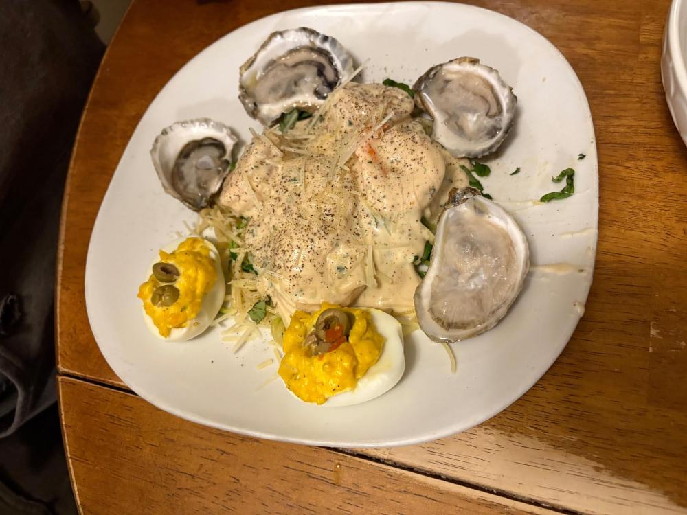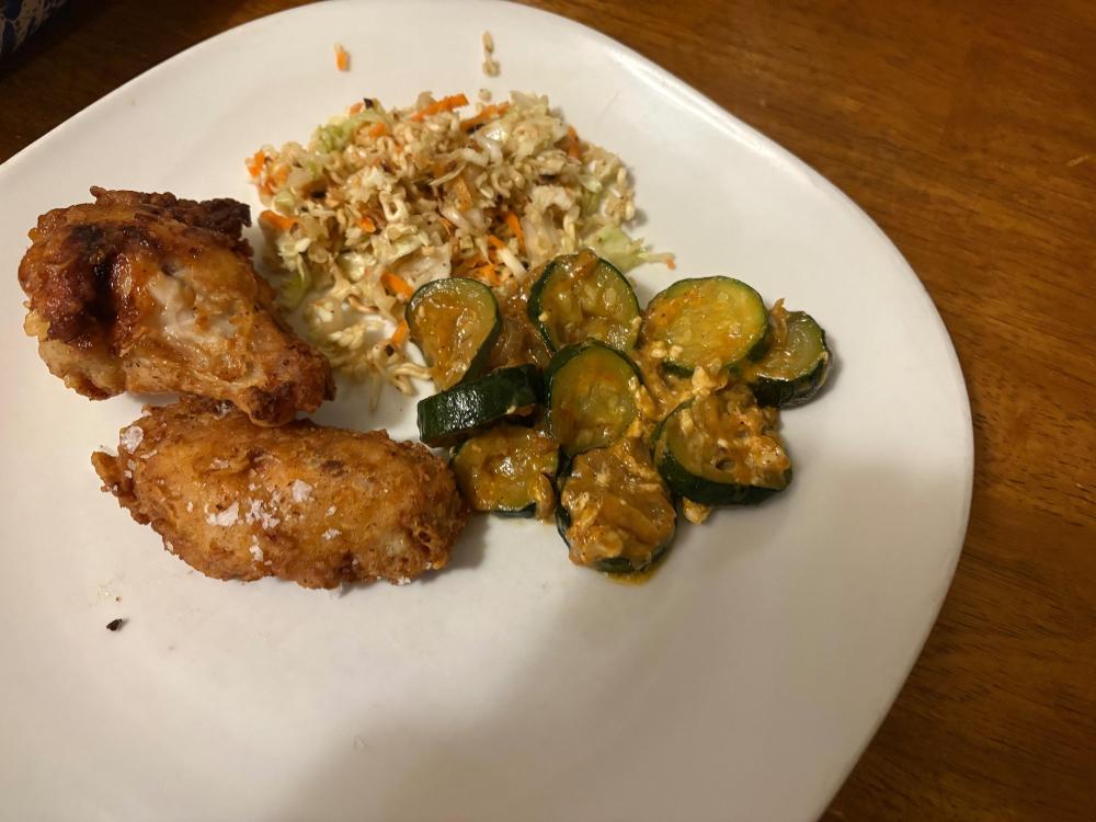 I've definitely been doing really bad about about sticking to the low carb/no carb thing. I hope I'm not slowly killing Ronnie one French fry at a time lol sigh. It's just hard in the throes of winter. I want alllllll the comfort foods and that means carbs. So, I hope I'm forgiven by his doctor. But I bet I'm not. Anyway. We've finally climbed out of the deep freeze. The snow that hasn't melted will today. I've turned the heater off that was by the pipes in the basement and turned the faucets off from the incessant dripping that was driving me crazy--but that's better than busted pipes. I better order my seeds for the garden within the next week or so because spring is fast arriving. Picked up a Sam's rotisserie chicken and got several meals out of it --quesadillas was one. Zoodles with the last of my venison meatballs and salad Really wanted some seafood so I dug out some of the oysters from the freezer--I have enough left for one more meal. Did some shrimp Alfredo with a mix of zoodles and regular pasta (I blame @Dejah--her shrimp alfredo up yonder looked so good). I had one jar of "apple" pie filling left that I canned --it's actually zucchini-so I made a galette for dessert Pizza night because I had left over sauce Chicken wings, squash and a cabbage salad Jalapeno sausages and fries Last night I climbed back on the no carb wagon and did SV'd pork chops, salad and cheesy cauliflower and broccoli