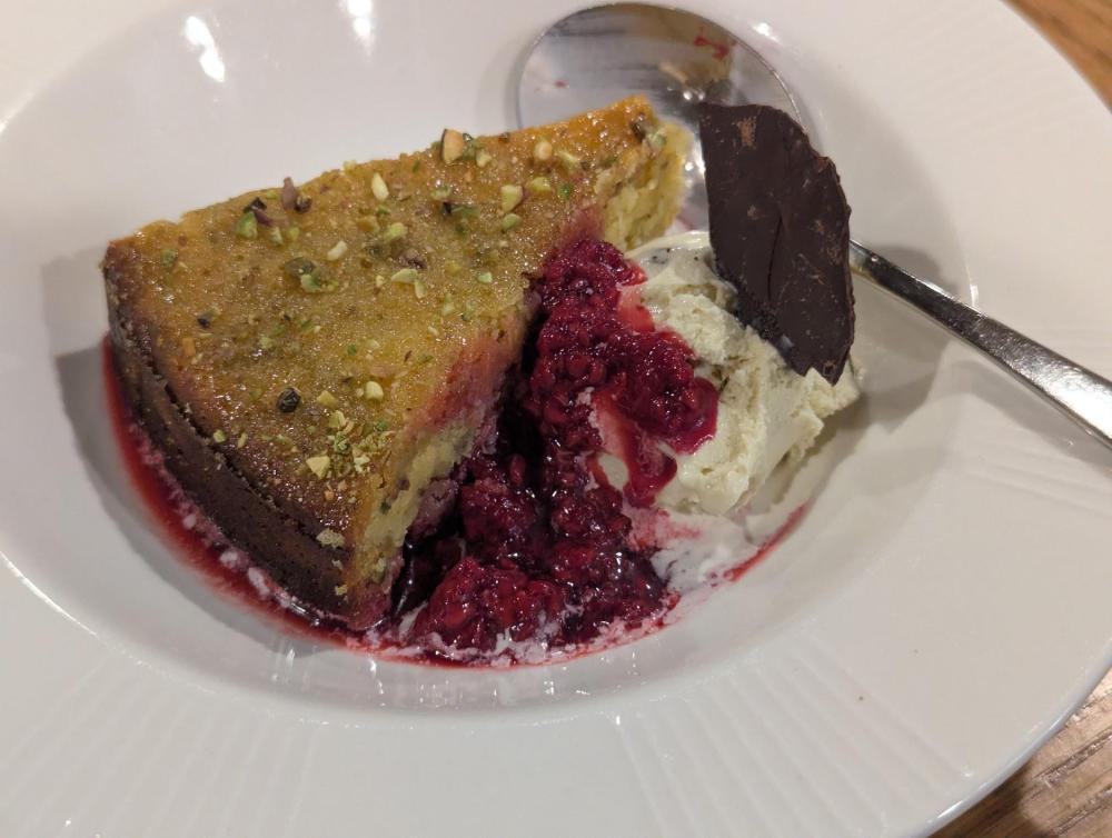twas the night before thanksgiving ,,no caps as i got a lap cat stuffed ricotta shells--basil pesto left 6--spinach right 6 flourless lemon pistachio cake finished with wild red raspberries, pistachio ice cream drk chocolate tweel Happy Thanksgiving All ( no cat )