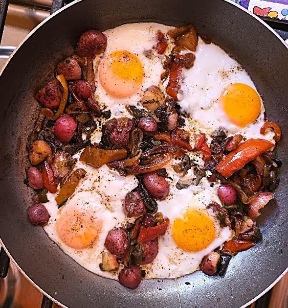 Breakfast for Dinner. Brought home leftover red cambray potatoes from lunch out and made a potato hash. No meat, no cheese, only eggs and my usual onions & peppers. I fry a heaping pan of onions, sweet red peppers and poblanos every week and store in fridge. It goes on and in a lot of our meals. Omelets, burger topping, pizza topping, tacos, quesadillas, etc.
