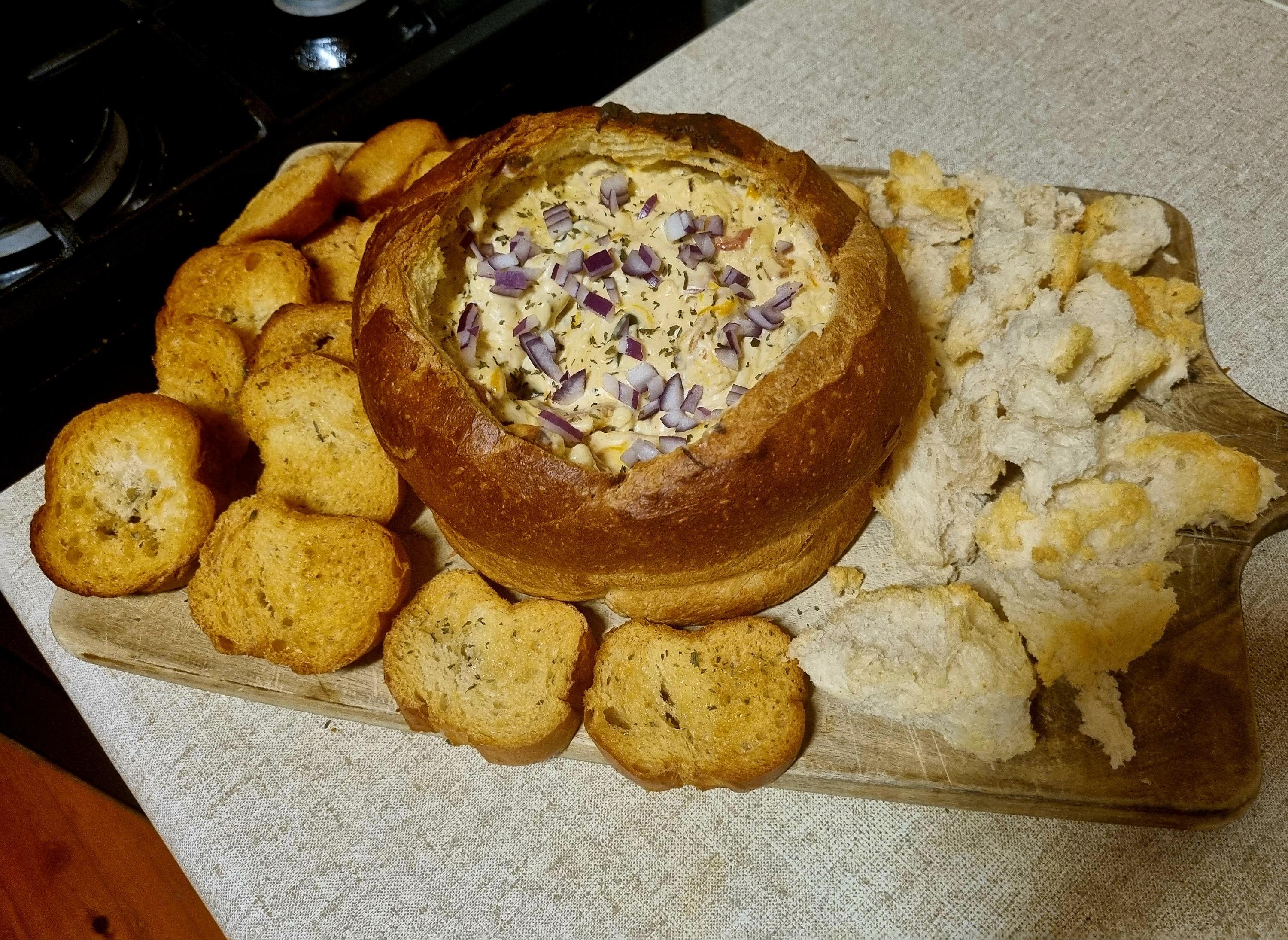 Carrying on strongly with the cheese theme; Sports Ball inevitably leads to the perfect marriage of casual Australian party food being stuck in the 80s and the equivalent British party food having to be beige. A Cob. My own personal fav combo of carbs, carbs, carbs and cheese. Featuring jalapeno and bacon. No, I'd prefer not to be reminded of Arteries at this time. 😅