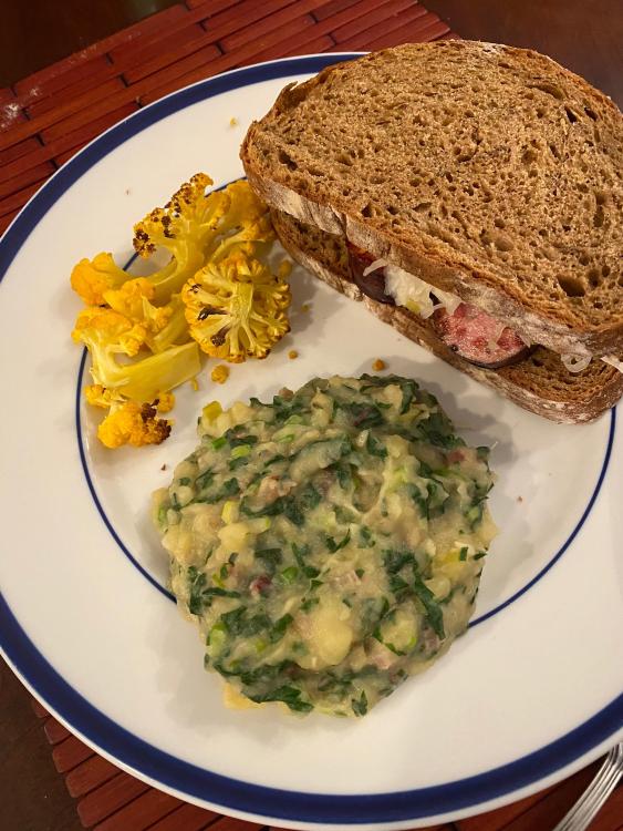Kielbasa sandwiches with Wedding Kielbasa and house made sauerkraut from the excellent Polish deli near us. Swiss Chard and green onion colcannon. Roasted cauliflower