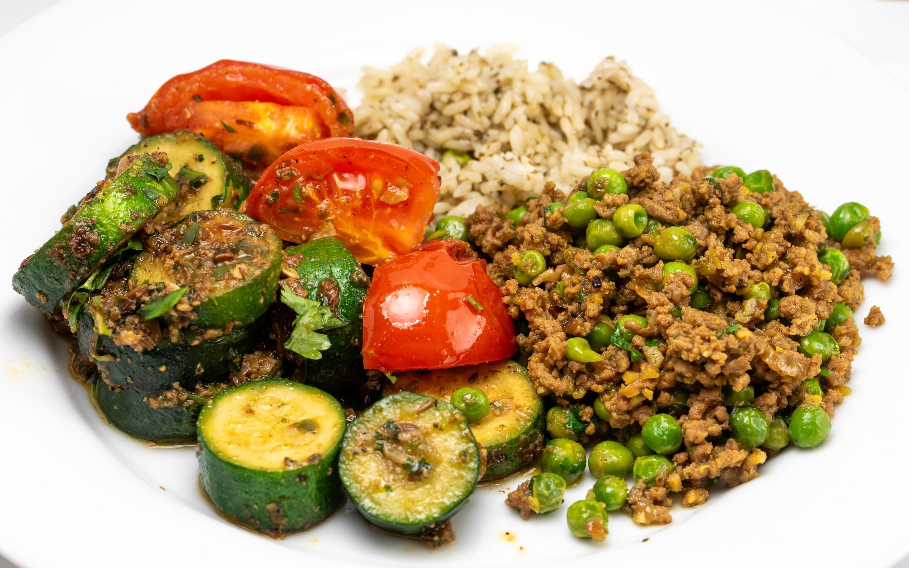 Sookha keema matar (dry-cooked spicy ground beef with peas): This is a long-time favorite, redolent of brown-fried onions, ginger, garlic, cilantro, and garam masala, sharpened with lemon juice. Roasted baby zucchini rounds: Seared with cumin seed, black pepper, garlic, ground coriander seed, ground cumin, and serrano chiles, and then topped with seared tomato wedges, cilantro, and garam masala. Mrs. C said that zucchini and cooked tomatoes are two of her least-favorite things, but she enjoyed this because nothing was cooked to mush.