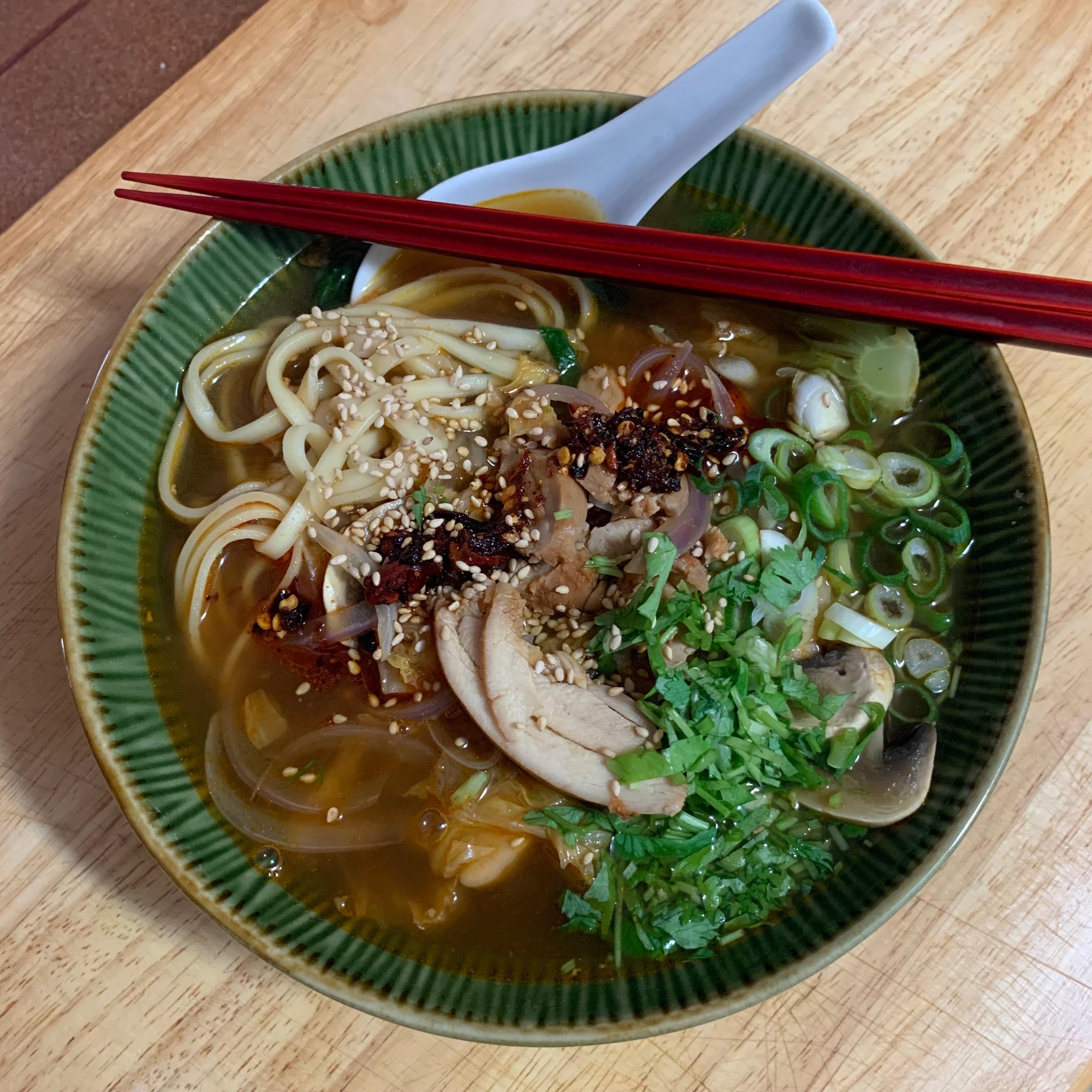 I made a kind of longevity noodle dish. These wheat noodles are over a metre long, the broth is enhanced with wombok, baby pak choy, mushrooms and chicken slices. Topped with coriander, green onion and chilli crisp, plus toasted sesame seeds. Gong hei fat choi !