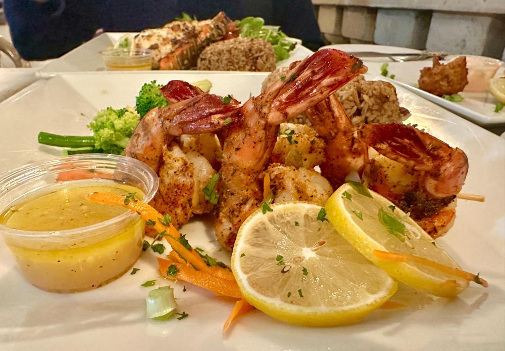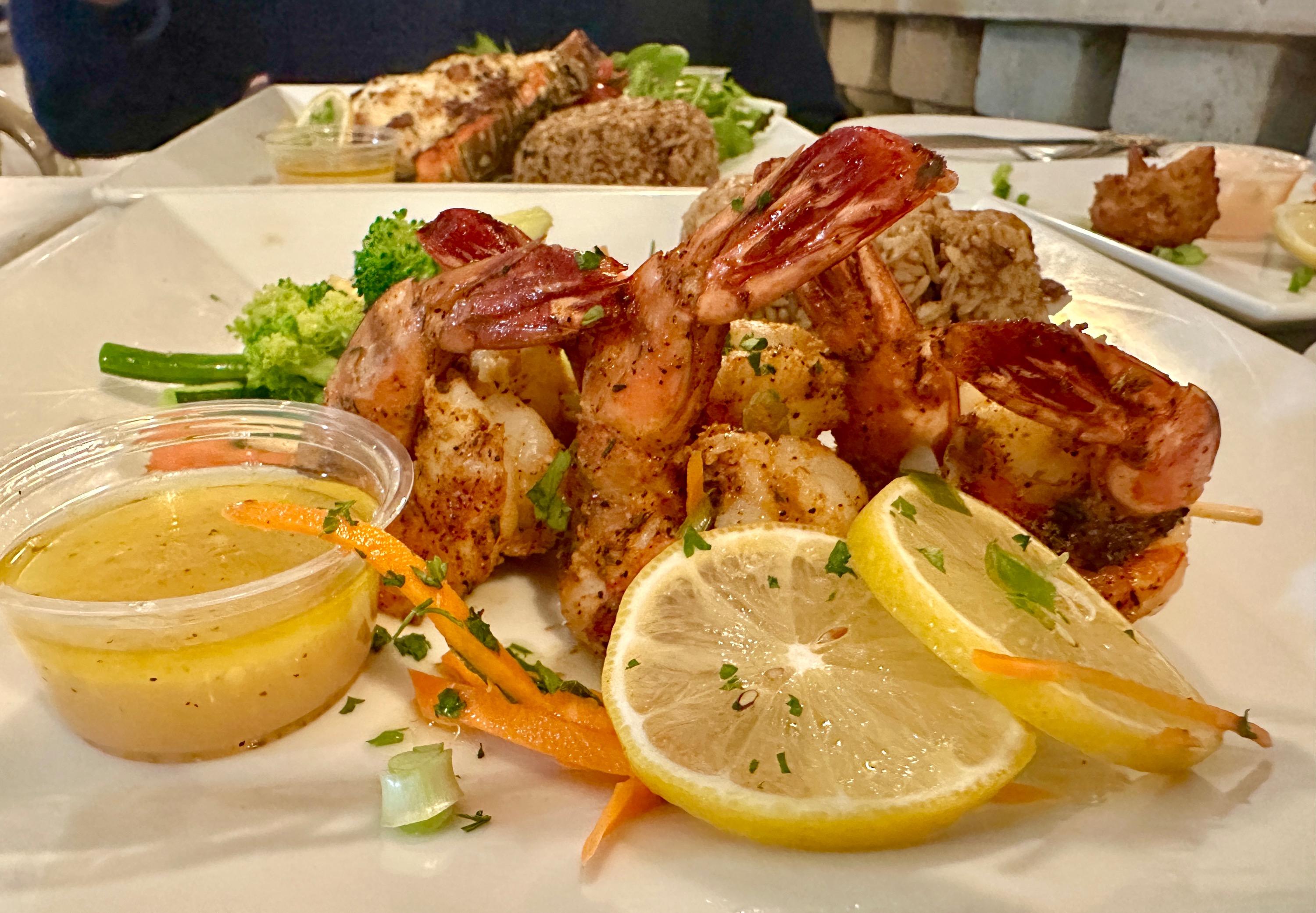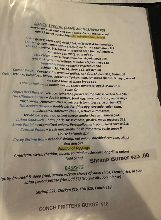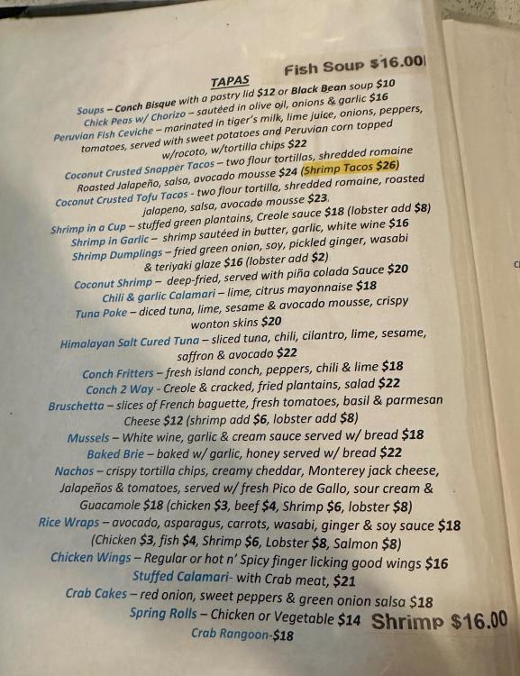 Warmer than at home 😀. It was 83 yesterday. The water is too cold for me to swim in, but I fully admit to being a wimp. I rarely get into the water in the winter, no matter the location. There were many other, hardier people swimming in the ocean yesterday. A “cold” front is moving in for the next day or so which is supposed to bring brisk winds and dangerous boating conditions. We moved over to the house yesterday. The road was actually in fairly good island condition until the very end. The directions we were given were terrible, so we ended up on a scenic tour of the area. There seems to be lots of new construction, as well as many properties for sale. Interesting. The house is in the Chalk Sound area, which is a more remote part of the island. The sound itself is protected National Park. You can swim or kayak in it, but there’s no motorized boating allowed. View from the house. The pool is supposedly heated, so I might try and go swimming later. Results doubtful 😂 There’s a private access to the water below the house, with kayaks to use. We will not be kayaking. I always end up going in circles. The kitchen Welcome basket from our on island host, filled with the junkiest junk food ever. If my niece and nephew were here they would be thrilled! I have found that junk food, especially chips, is actually one of the most expensive things to buy on an island, so it’s a nice gesture. I am saving my junk food ration for conch fritters though. As an aside, we went grocery shopping before coming to the house, and I was pleasantly surprised by the variety and cost of the food. It was more than at home, but not even close to the grocery prices we pay on St. John. They had a wide variety of organic food, lots of fruits and vegetables in good condition, and a large bakery selection. I did not check out the meat or frozen sections, but overall it was a very good experience. By the time we were all settled at the house it was getting dark, so we went to the closest restaurant to the house for dinner, Las Brisas. I did not take pictures of the restaurant because it was dark, but we will probably go back for lunch at some point. It’s an open air waterfront restaurant, with a pool that guests can swim in if they want to. I think there are tables on the beach that are open at lunch, but it was too dark to tell. We had a dining companion The menu is massive. We shared some conch fritters. They were really good, jammed with conch. The fish of the day was snapper or grouper. I saw the snapper going out to other tables and it looked really good, but I wanted shrimp since I cannot eat them at home. Blackened shrimp with peas and rice and vegetables Husband had a grilled lobster with peas and rice and salad No dessert.