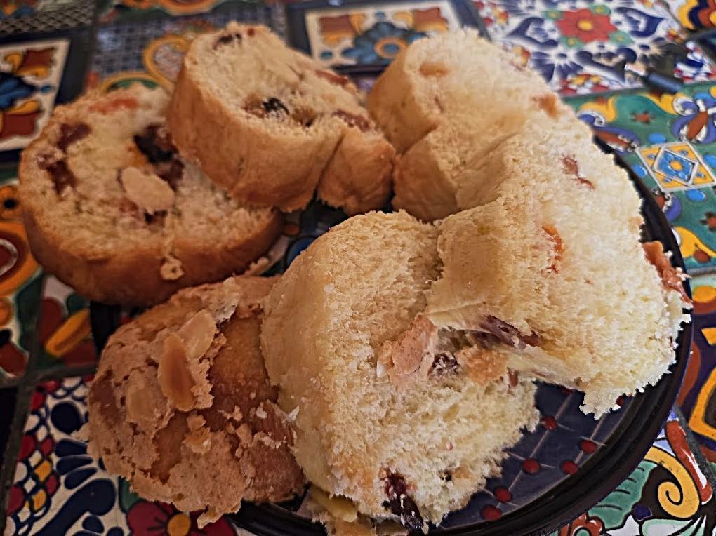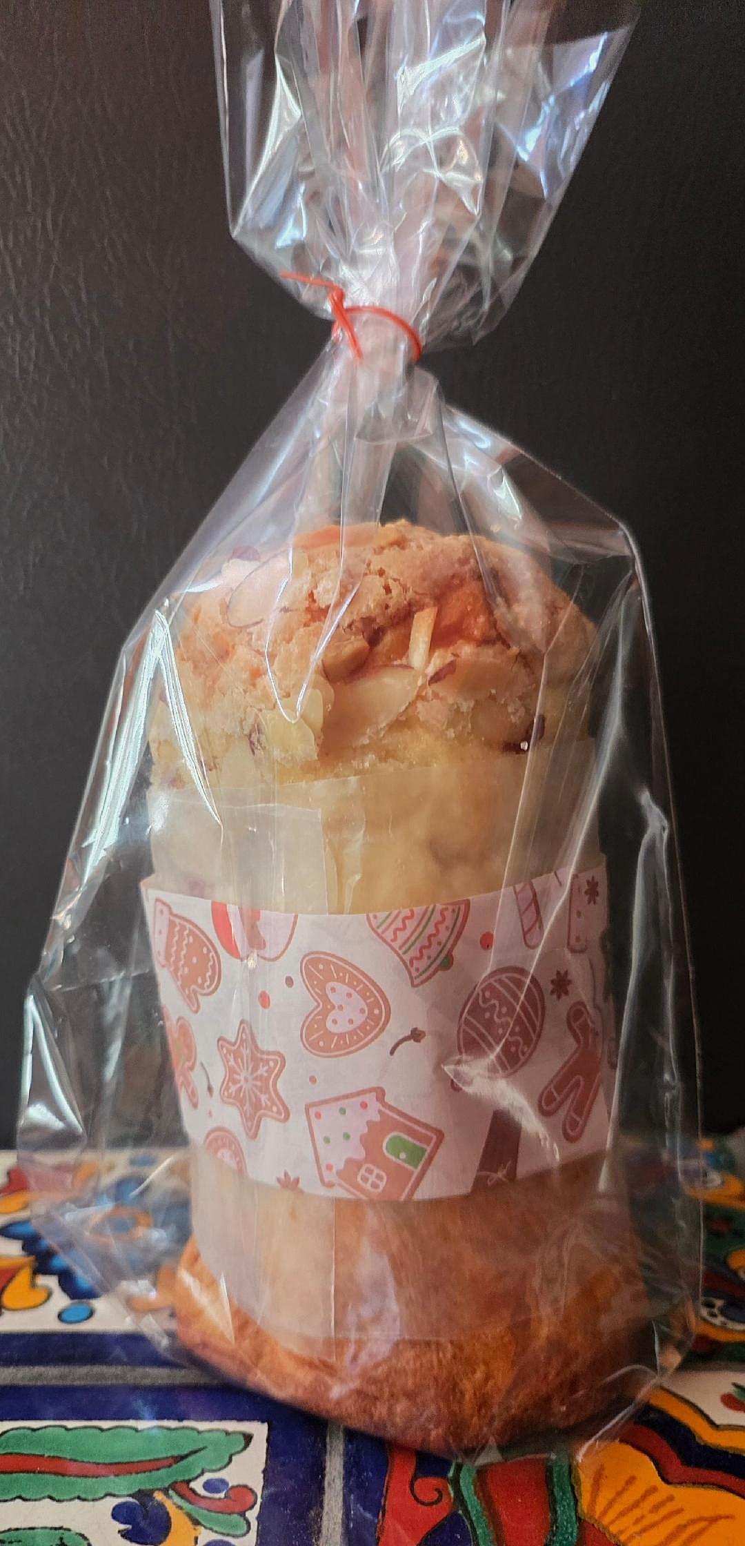 A locally made Panettone (Guadalajara) sold at my local deli in Ajijic. And not the size of a hatbox! Very tasty with good addition of candied fruits. No raisins detected in my first slice.