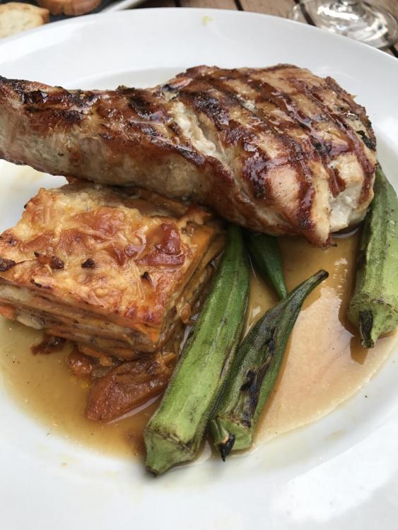 The salad is a base of mixed baby greens, with fennel, celeriac, sliced apple, toasted pecans and lardons. The vinaigrette is based on caramelized apple + apple cider.
