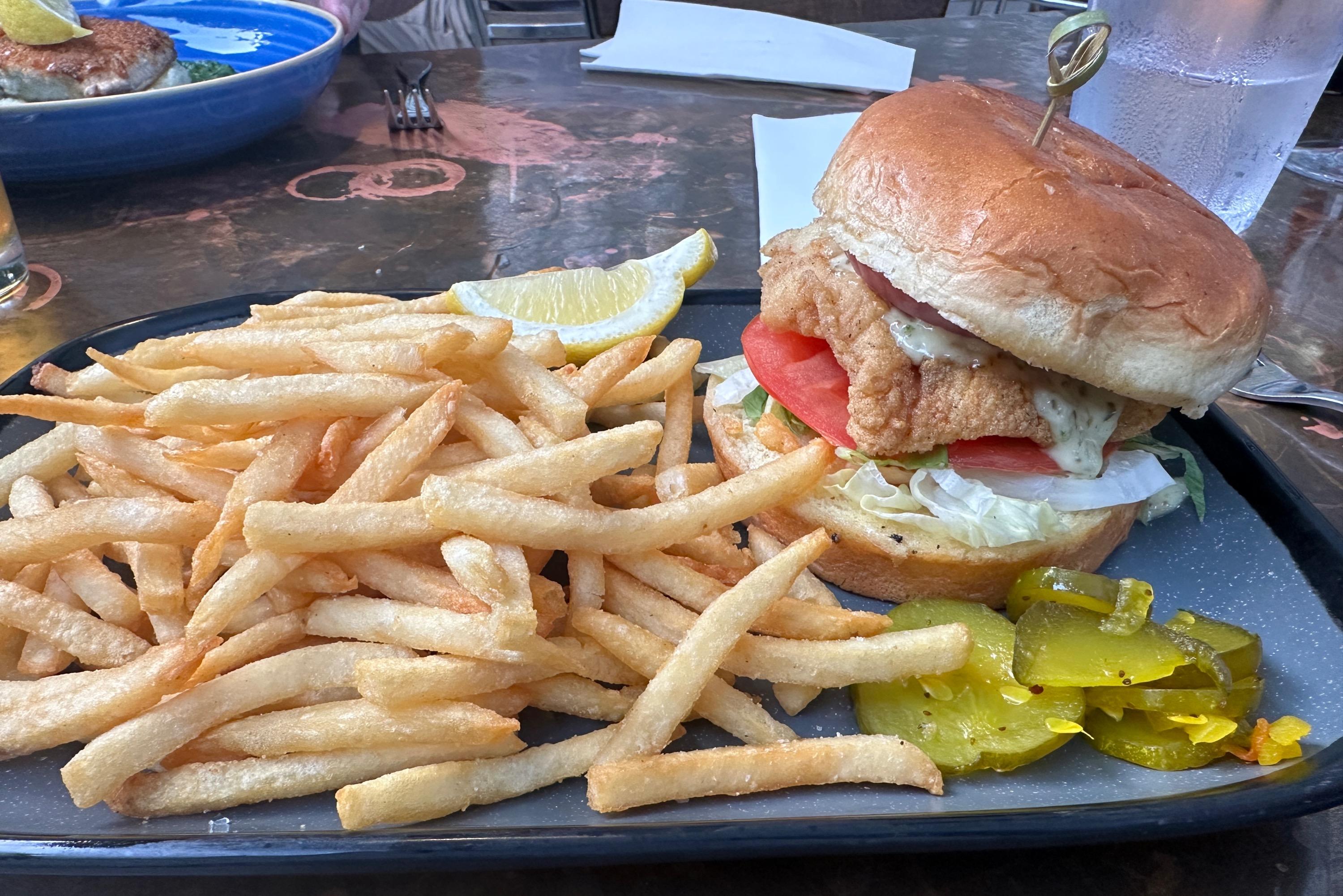 I’m on a very quick jaunt to Bermuda to celebrate husband’s birthday. Flying time is under two hours, and it’s warmer here than at home. We arrived yesterday, and only plans we made for this fast visit were to sit on the deck and take in the view, go down for occasional beach walks, and eat fish for dinner. We have been successful in following the itinerary so far. The view from our condo at the Reefs Looking towards the hotel from our deck and a sliver moon view from our arrival evening. The sun sets just after 5 at this time of year. There’s a new restaurant at the Reefs. Here’s the menu We ordered a special of lionfish crudo to share. I would have preferred the fish to be sliced a little thinner, but the flavors were good. Husband had the grilled lobster. He said it was delicious i had a special of coney fish, which came with carrot puree and the same asparagus sauce that was on the lobster. I really loved this Mini cannoli dessert We enjoyed our dinner so much that we cancelled another reservation elsewhere to come back tomorrow night. Today’s beach—Church Bay. The water was too cold for me to swim though other brave souls were in the water A light lunch at Coconuts Wahoo tacos. We just split this pate since we were going to dinner later. Tonight’s pre dinner deck view We went to Aurora for dinner. They have a new sushi menu, but we were not in the mood. Tuna tartare to share Husband had lobster and shrimp spaghetti. I think he orders this every time we eat here. I had a special of herb crusted turbot with potato purée, minced vegetables, and fish jus. We split a slice of coconut chocolate cake with coconut sorbet to continue the birthday theme