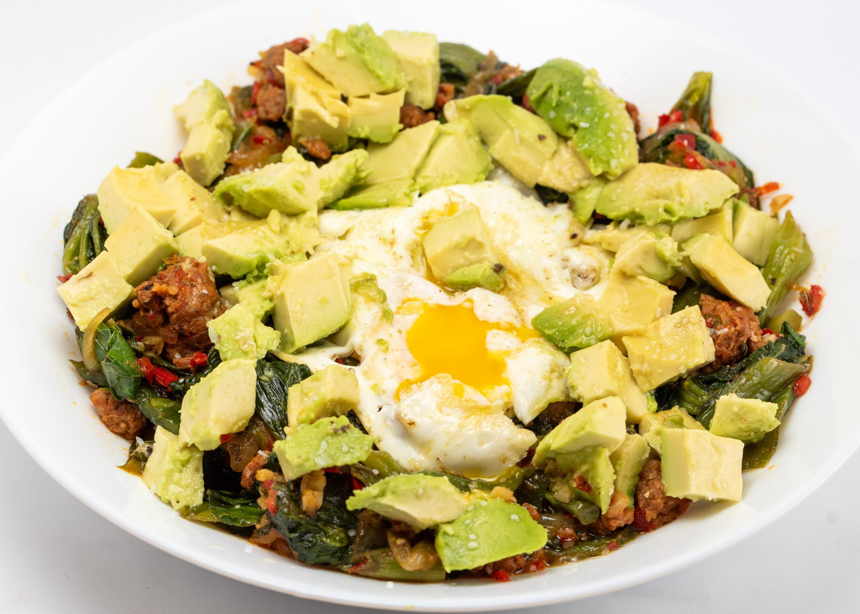 Spinach, chorizo, and eggs with onion, garlic, and chiles. Cilantro, thyme, and Mexican oregano for aroma; a little yogurt for richness.