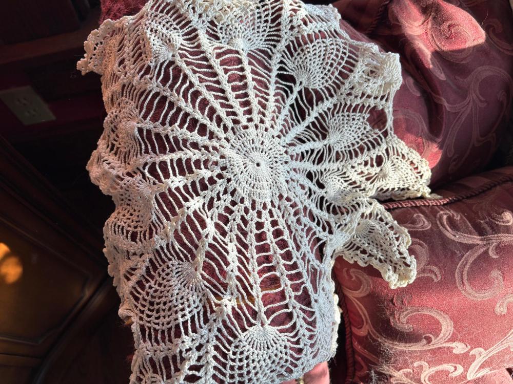 I went through some drawers in the dining room and pulled out a few things: Lots of lace tablecloths and a billion lace? Crocheted? Things in all shapes and sizes like this: