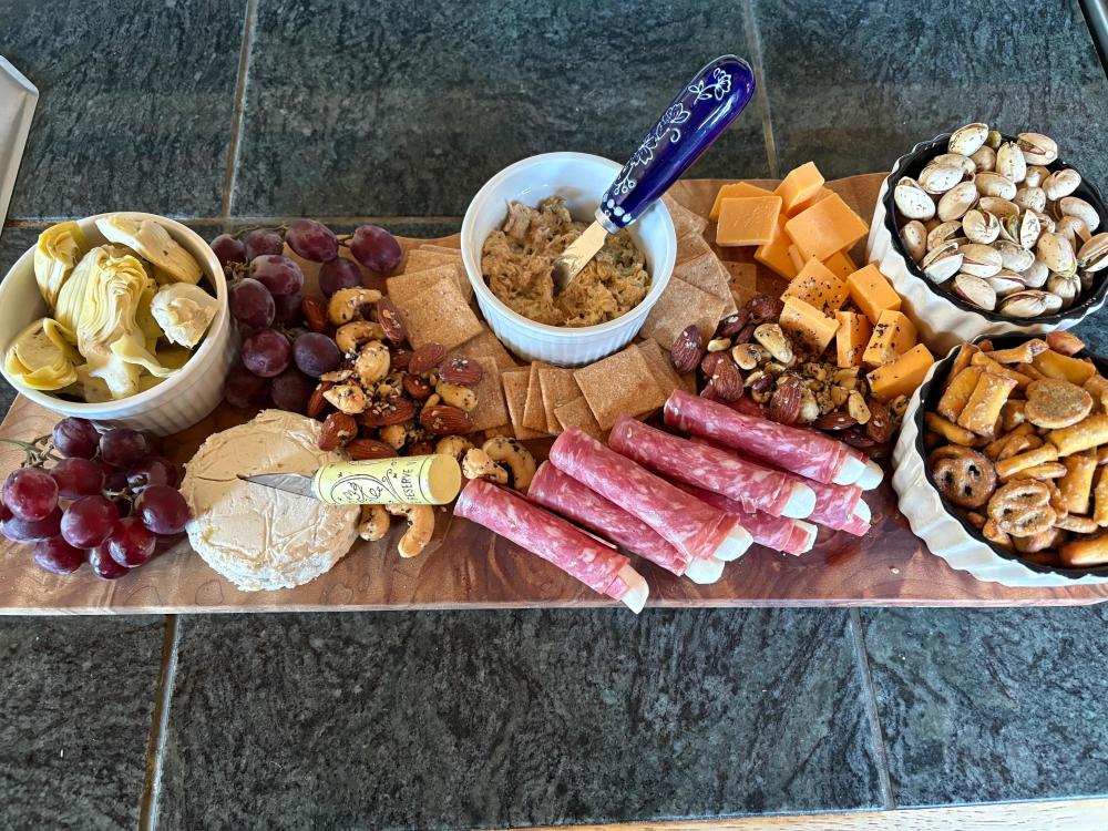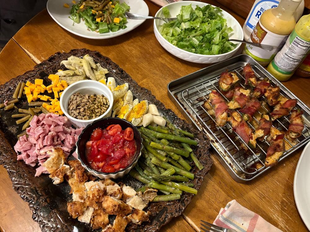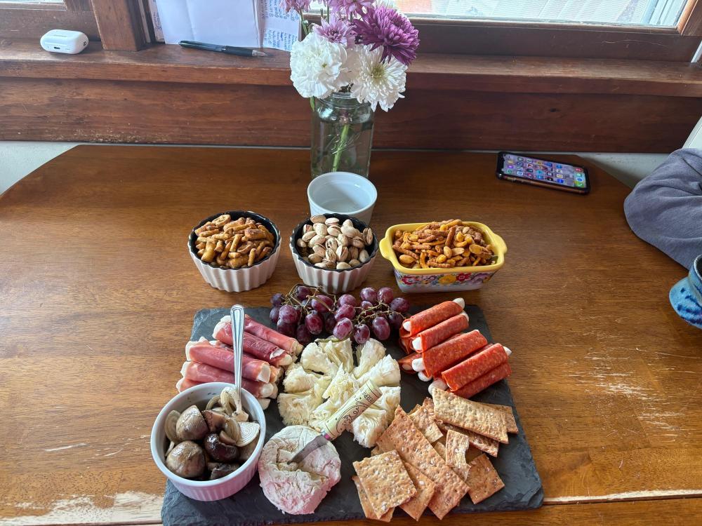 CRAVING linguini and clam sauce. I even have decent canned clams...... Now THAT is a hot dog. And those buns look amazing. Good on your wife for doing great on the low carb thing! I've found it....challenging and I cheat too much. Ronnie is doing good, though, still. I have cauliflower on hand at all times it really comes in handy. I make a bake like that frequently. If you haven't tried it already, cauliflower "potato" salad is really good too. That looks so fresh and delicious. I think (fingers crossed) things are finally slowing down around here--I don't want to jinx myself. The last few days have been very rainy and coldish. I'm loving it. I guess one upside of a hailed out garden is that I'm not worried about cold and when it's going to freeze. We've made the trip twice now to buy tomatoes from the Amish farm.....I'm thinking about trying one more time but I better hurry up because it's supposed to frost/freeze later this week possibly. So, big salad night still has decent tomatoes. My mom came to see us! We were talking and having too much fun so I forgot to take a ton of pictures but here's a few: Welcome mom snack board We try to make two salads that we both love but our spouses don't--this time mom made the delicious ramen salad first and we didn't get the second salad done sigh. Platter of SV'd pork chops, deviled eggs and cheesy squash (did I mention a squash plant bounced back and is producing??? Those things are hardy I'm tellin' ya) Mom sent birthday cupcakes With sparklers! She also had a Skyline Chili kit sent that included hotdogs so Ronnie could have a low carb version. Super fun!!!! Another snack board As always her visit was too short but as always glad it happened Last night yellow squash pizza boats and a galette to use up a lot of the fruits that she and I had snacked on during her visit.