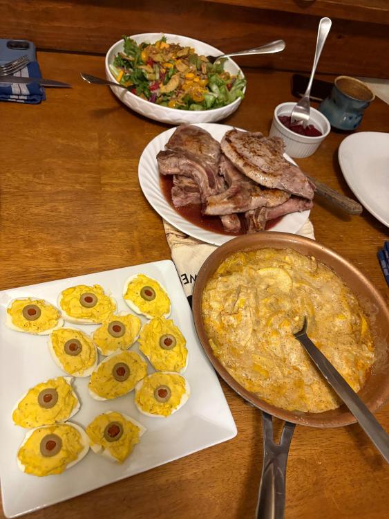 Ooooof. Where to begin? As some of you know we had a major hail storm the beginning of September. Time has flown so fast it still feels like it just happened last week. We're slowly getting things fixed up and back to normal. Roof people can't even start until possibly next spring they are so backed up. Luckily I haven't found any leaks. Anyway, all of the sudden it was time for our hunter friend to be here 😮 **panic** lol. He arrived last Wednesday and left on Sunday--it was so hectic that I couldn't post anything in real time. Hoping that the December visit is muuuuuch calmer. So. Here's a bit of what we got up to: I managed to throw a quick chalkboard drawing together (thank you internet for the inspiration) and got some fall/Halloween decorations put up. Ronnie's granddaughter was selling mums for a school fundraiser so I bought some for the porch--our pumpkin patch got demolished so I didn't have any pumpkins (insert major crying face). I was shocked when Ronnie and our friend arrived from the airport and unloaded a ton of pumpkins that they bought for me! Now, if the cattle come to visit me this winter I'll have at least a little snack for them to enjoy. I really dropped the ball taking pictures a times- so I'll have to piece in here and there. The first night, since they had grabbed lunch not too long before, I put out just a few snacks. @HungryChris's marinated mushrooms were again a hit. I've been ordering from Nuts.com and loving some of their offerings--these spicy pickle pretzels are addictive. That night I IP'd ribs that Ronnie had smoked along with stuffed jalapeños and baked beans. Next morning they got up early to go dove hunting and work on the deer stands etc. Scout got to go and had a blast. A dove cleaning pictorial--as usual they saved all of the livers, gizzards and hearts, too. On the way home they stopped off in a mostly Amish community and bought some homegrown tomatoes--it pains me to type that lol. But we had none, again, due to the hail. They're better than store bought....but not near like ours. Another snack board Ronnie really wanted me to do pressure cooked chicken gizzards. That's a LOT of frying when there are three of us. But, I started at like 3 in the afternoon and got done around 4:30. I included the guts from the doves. Pressure cooked for 40 mins along with salad and gravy for dipping Next morning more doves were gotten. This time, I asked them to pluck them so I could freeze them and we'd have them roasted in the oven over the winter. I wrapped them in saran and then vac packed them