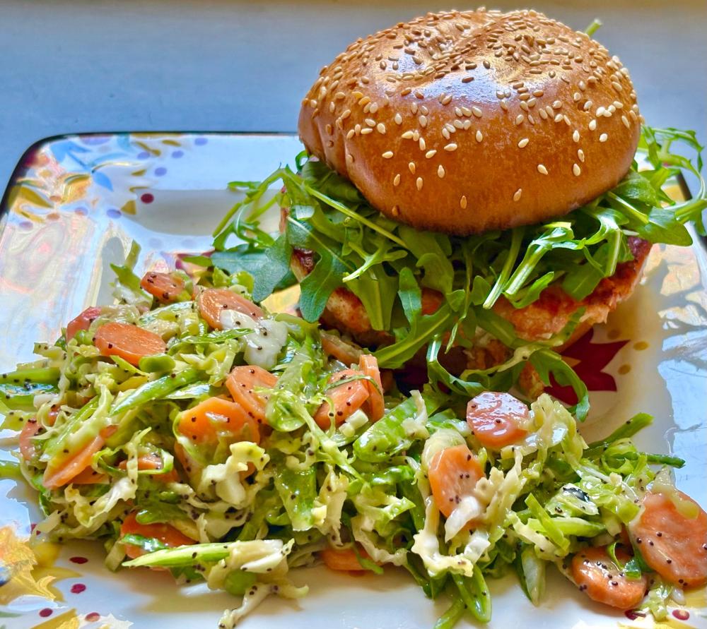 Salmon burger on a brioche bun with arugula and yuzu mayo and a quick slaw of Brussels sprouts, carrot, snap peas and scallions
