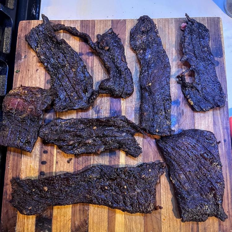 A couple months ago, I bought a cookbook because I know the author. There is apost about it here at "Cookbooks and References". It is the next to last entry on the topic Show Us Your Latest Cookbook Acquisitions. I'd post a direct link to it if I knew how to do it. I've read the book from cover, now I am starting to try some of the recipes. the two I did today are Travelers Meat Pie and Jalapeño Bison Jerky... only I used a round roast.The Jerky shown here is about half the recipe. The rest is already gone. The author is half sister to my son's former wife and her heritage is Mexican and Potawatomi.