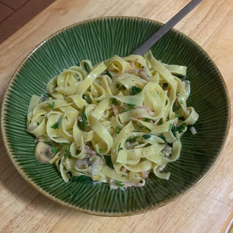 Pasta, egg tagliatelle with a sauce of bacon, mushrooms, garlic, chilli, and baby spinach. A sprinkle of finely chopped parsley and lashings of pecorino. I know that ‘he who must be fed’ will never say no to pasta.