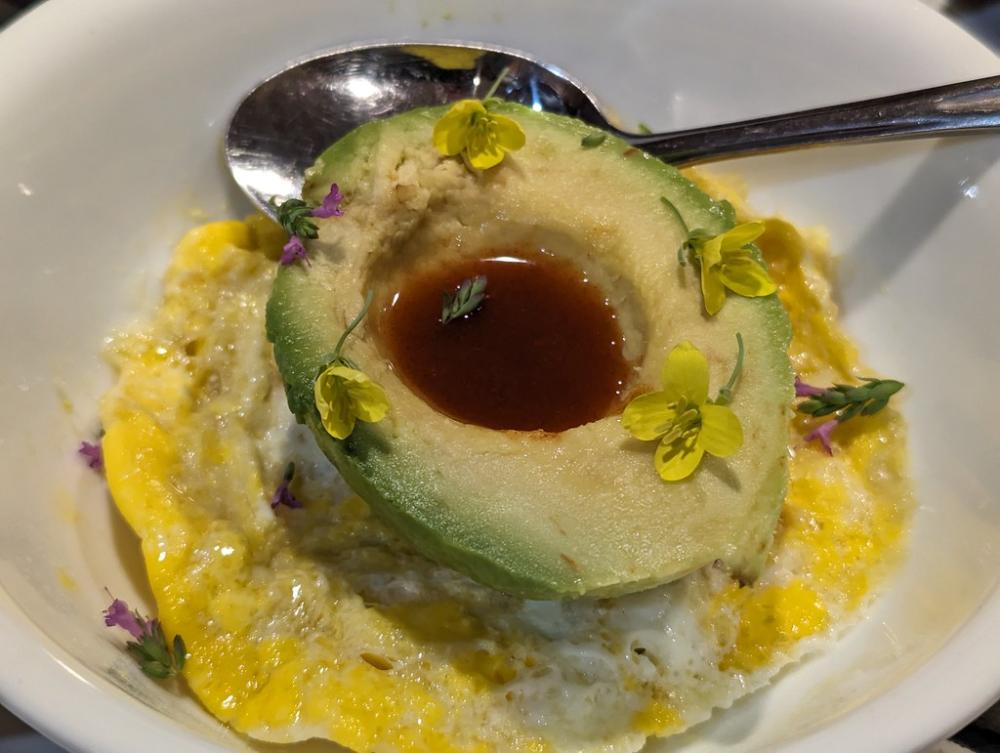 Interesting presentation. Did the avocado end up semi warm? And the T is in the pit pocket - that is a hefty dose. Nice on the herb flowers. I miss my herb garden and the ability to walk out and pluck what moves me.