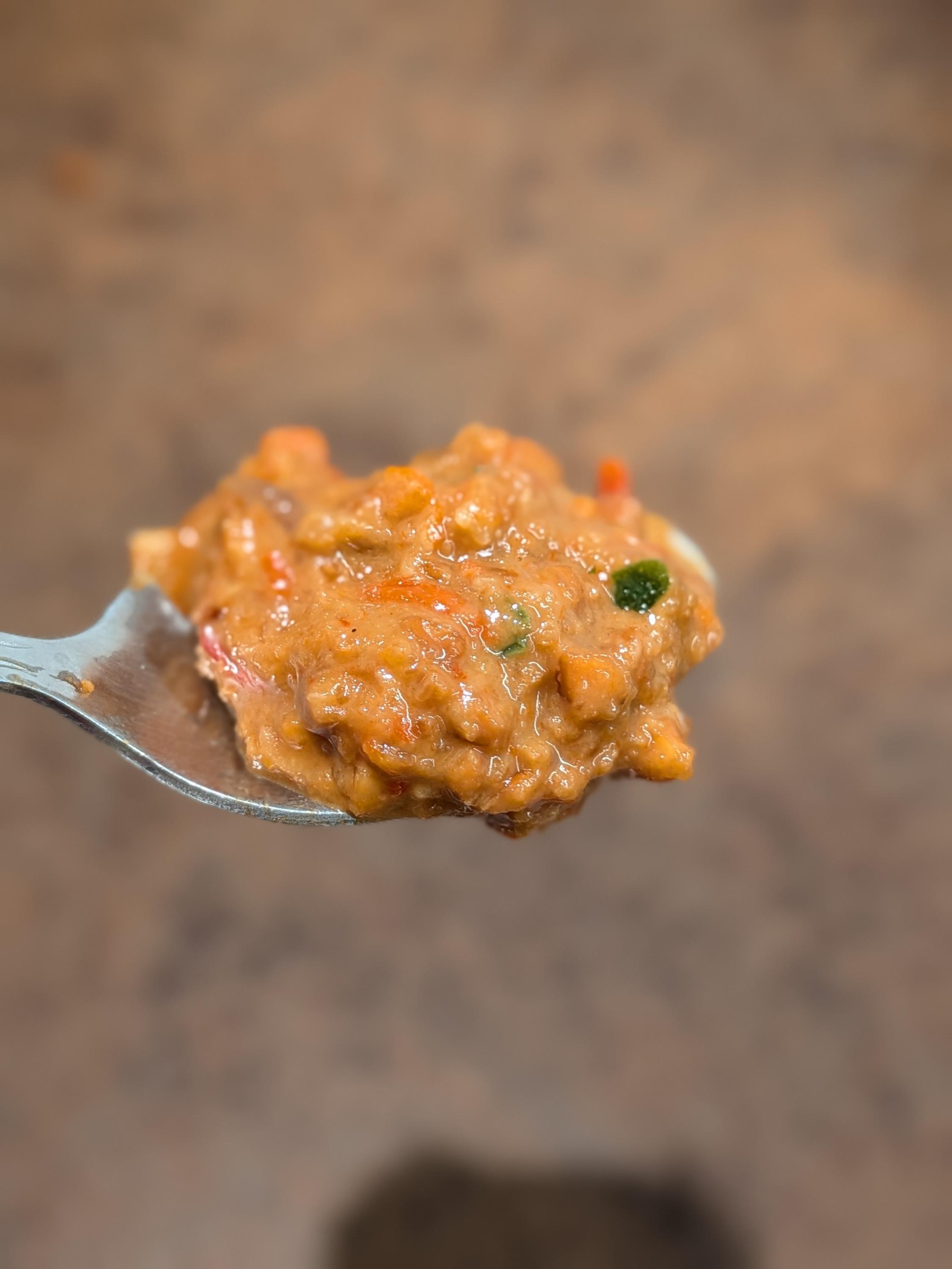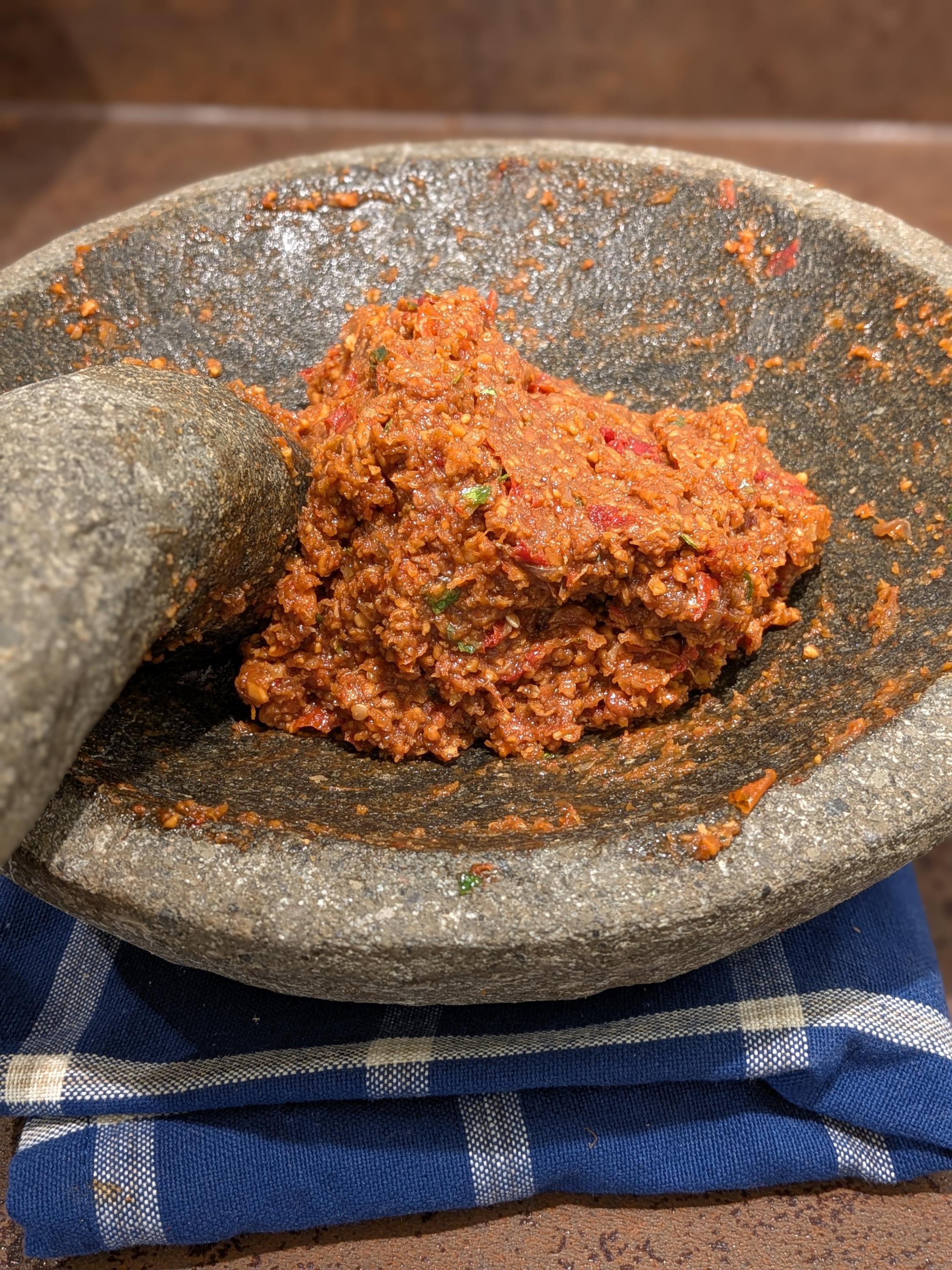 8 ) Move the chilli/shallot, etc mixture to an Indonesian mortar (cobek), add the tamarind, salt, MSG and palm sugar then grind until smooth as possible